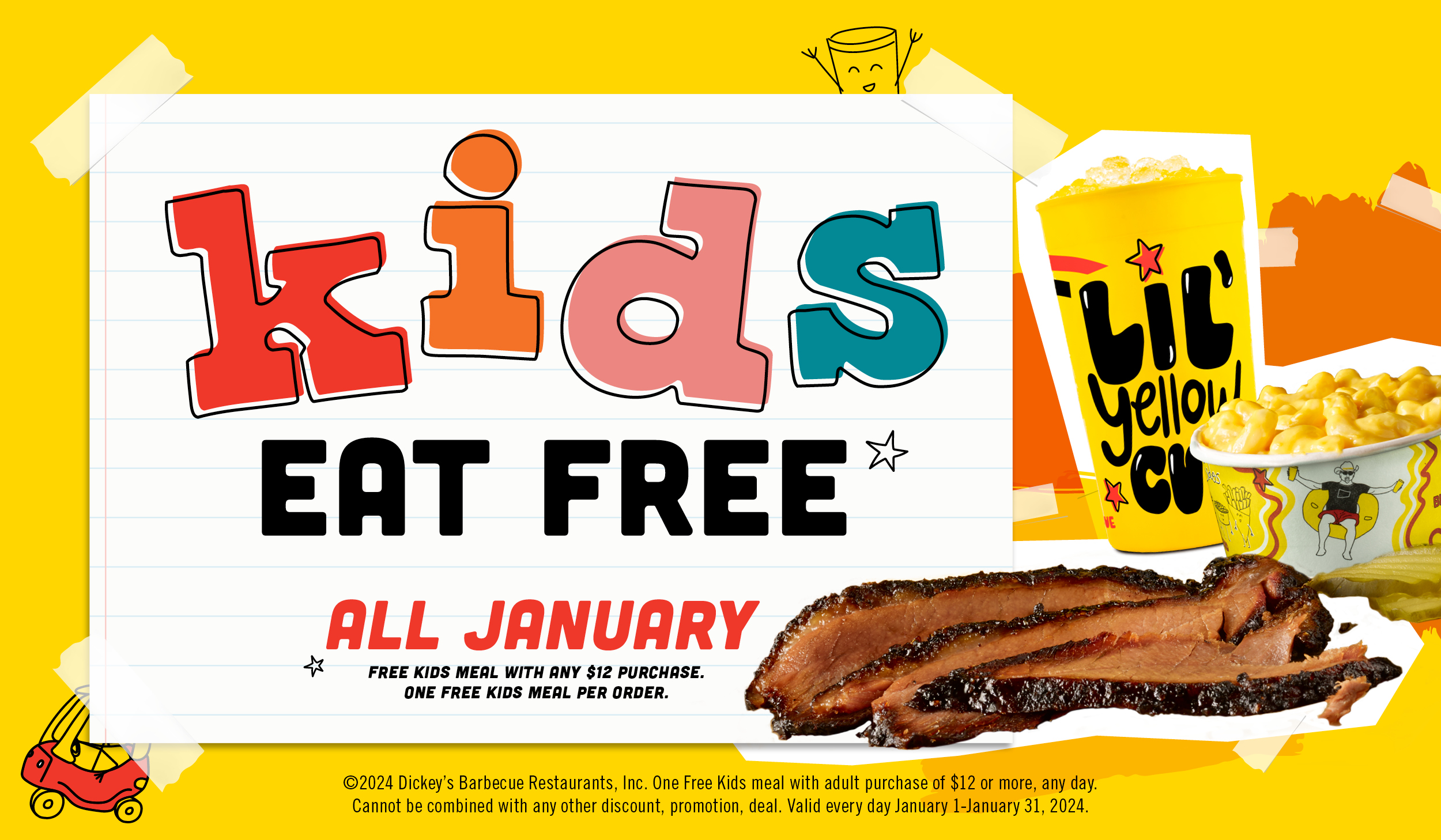 Dallas, Dec. 27, 2023 (GLOBE NEWSWIRE) -- Dickey’s Barbecue Pit is kicking off the new year with a fantastic Kids Eat Free promotion for the entire month!