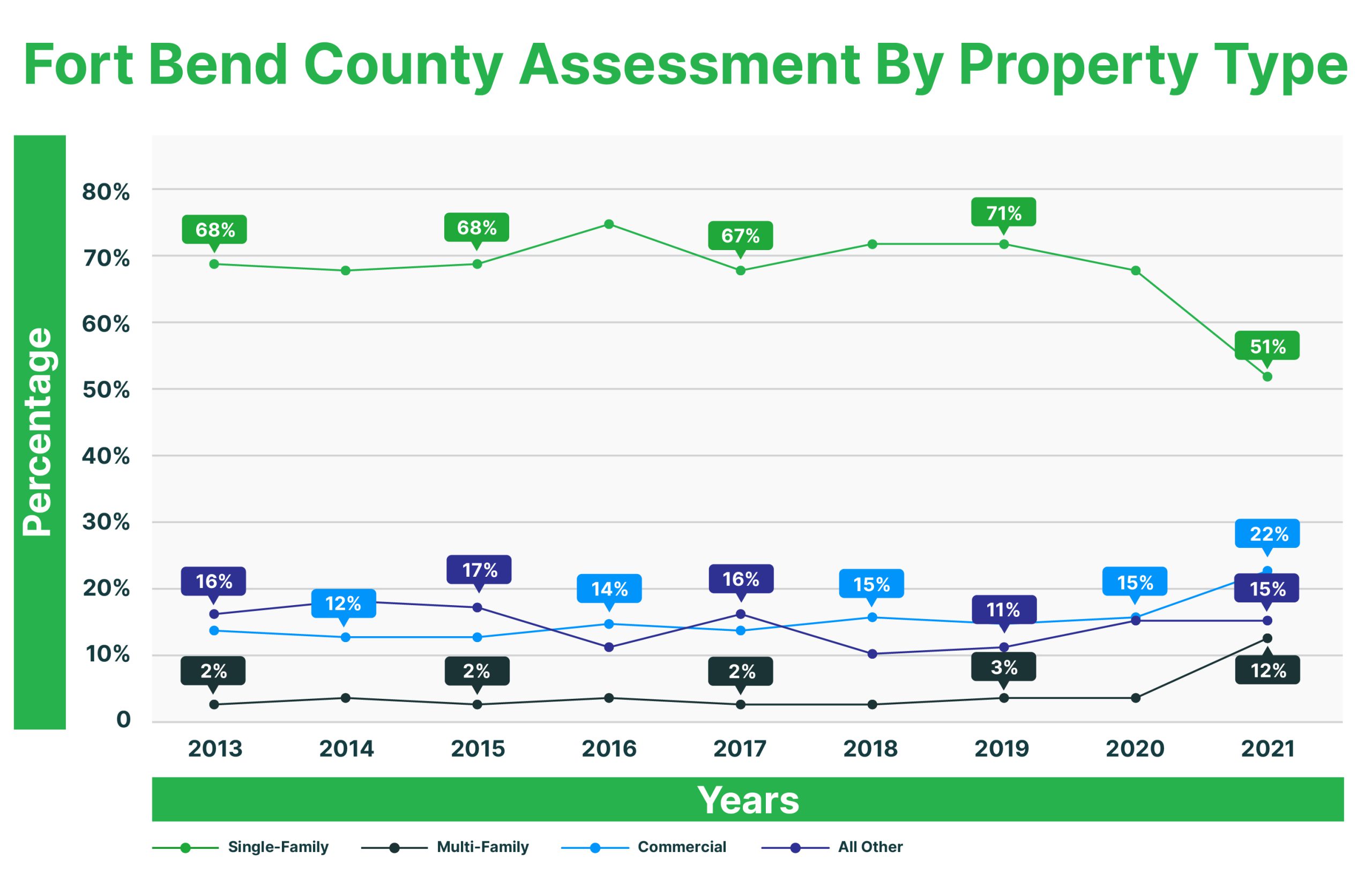 The value of all commercial types of property in Fort Bend County rose from $19 billion in 2014 to $36 billion in 2021. The 2014 breakdown was $1 billion apartments, $8 billion commercial and $10 billion BPP / industrial / other. The 2021 breakdown was $3 billion apartments, $16 billion commercial and $17 BPP / industrial.