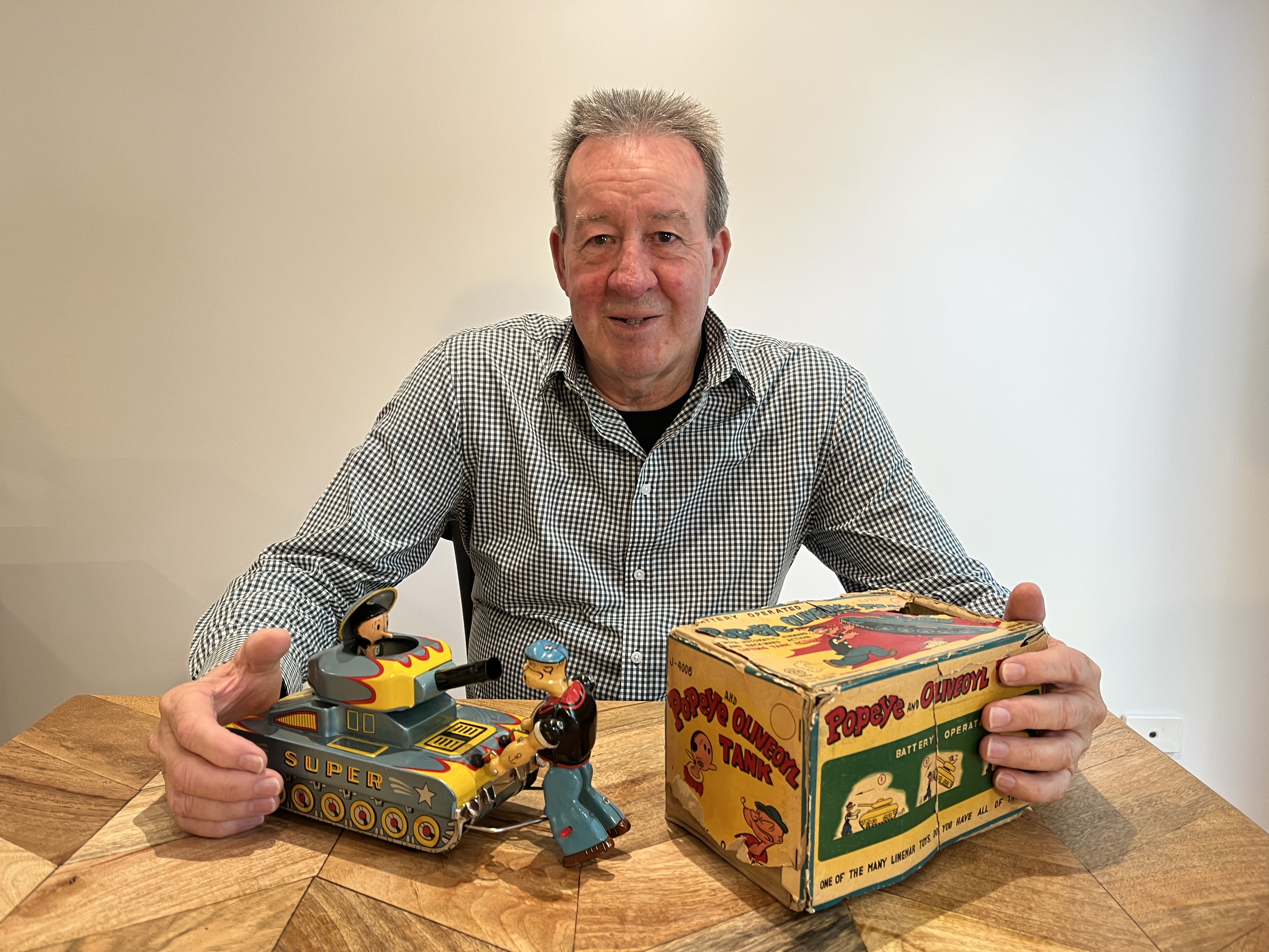 John Elsbury with the boxed Linemar Mechanical Popeye & Olive Oyl Tank he kept ever since receiving it 66 years ago as a 7th birthday gift from his parents. Estimate: $40,000-$60,000