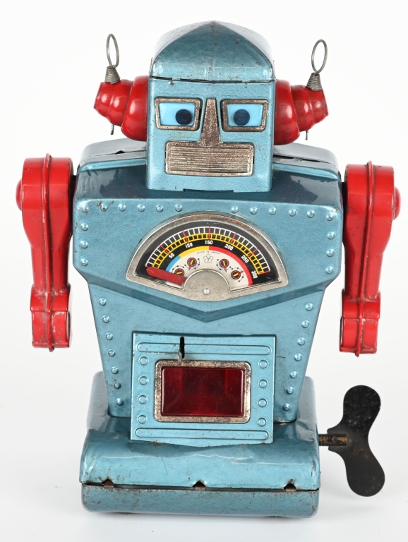 Exceptional Japanese robots and space toys from the same production period as the comic-character tanks will be jockeying for the auction spotlight as well. A fantastic Yonezawa 10-inch windup Diamond Planet Robot is an especially rare variation with a silvery-blue body and red arms and ears. “Any Diamond Planet Robot is like a Faberge egg to robot collectors. It was made in two color variations – red body with blue arms and ears, and the even rarer blue body with red arms and ears, like the one in our auction. They simply do not turn up for sale anywhere,” said Miles King. The auction example is complete and all-original, with its distinctive googly eyes, “oxygen meter” [on chest], and large windup key. “It’s a great example of what is arguably the most sought-after of all robots,” King continued. “Only a few have ever come to market, so it’s sure to attract strong competition.” Estimate: $20,000-$30,000