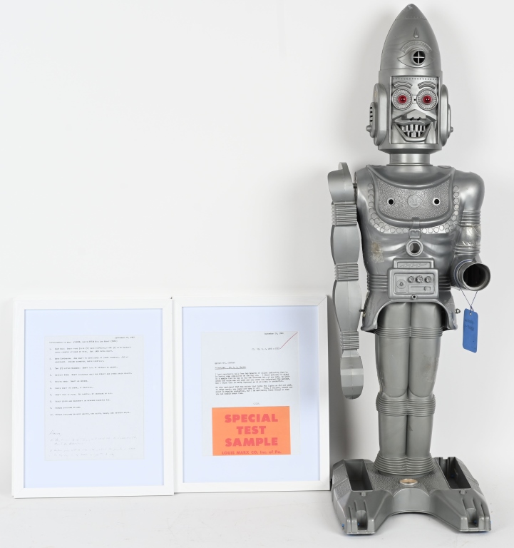 The word “prototype” is music to any toy collector’s ears, and that certainly applies to robot fans, who will have a real treat in store at this auction: THE prototype for Marx’s Big Loo Giant Moon Robot. Standing 38 inches tall and of a form that is identical to the production robot that followed, the unpainted silver Big Loo was acquired directly from the toy’s designer, Harry Evanoff, in 1963. It has production numbers on its back and retains a Marx sample tag that says “7650, Big Loo, Erie, Return to Harry E.” The auction lot also includes archival letters from Louis Marx about production issues and returns, and other unique documents such as a test-sample letter and a timesheet showing hours spent in development. The godfather of all Big Loo robots has been assigned a $15,000-$25,000 estimate.