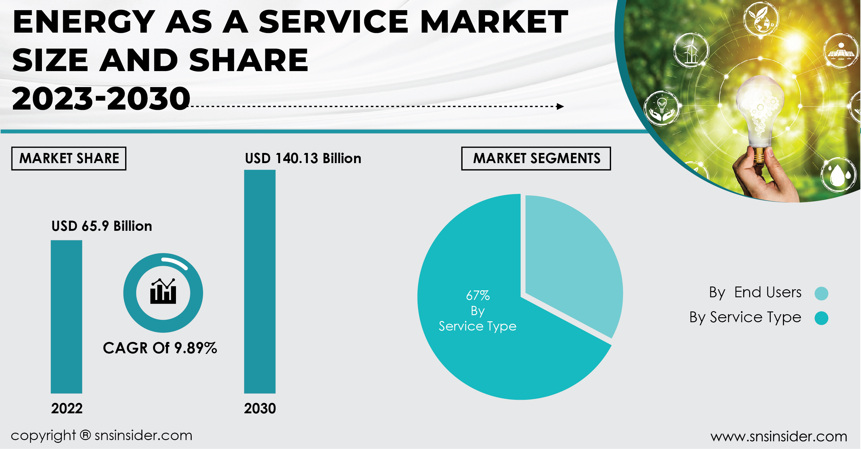 AUSTIN, TEXAS, UNITED STATES, January 9, 2024 /EINPresswire.com/ -- The ๐๐ง๐๐ซ๐ ๐ฒ ๐๐ฌ ๐ ๐๐๐ซ๐ฏ๐ข๐๐ ๐๐๐ซ๐ค๐๐ญ, valued at USD 65.9 billion in 2022, is poised to reach USD 140.13 billion by 2030. A compelling compound annual growth rate of 9.89% is anticipated, reflecting the market's strategic positioning in the dynamic energy sector.SNS Insider's latest research unveils profound insights, forecasting a remarkable future for the Energy as a Service Market. This transformative growth is propelled by innovative services catering to the evolving energy landscape.