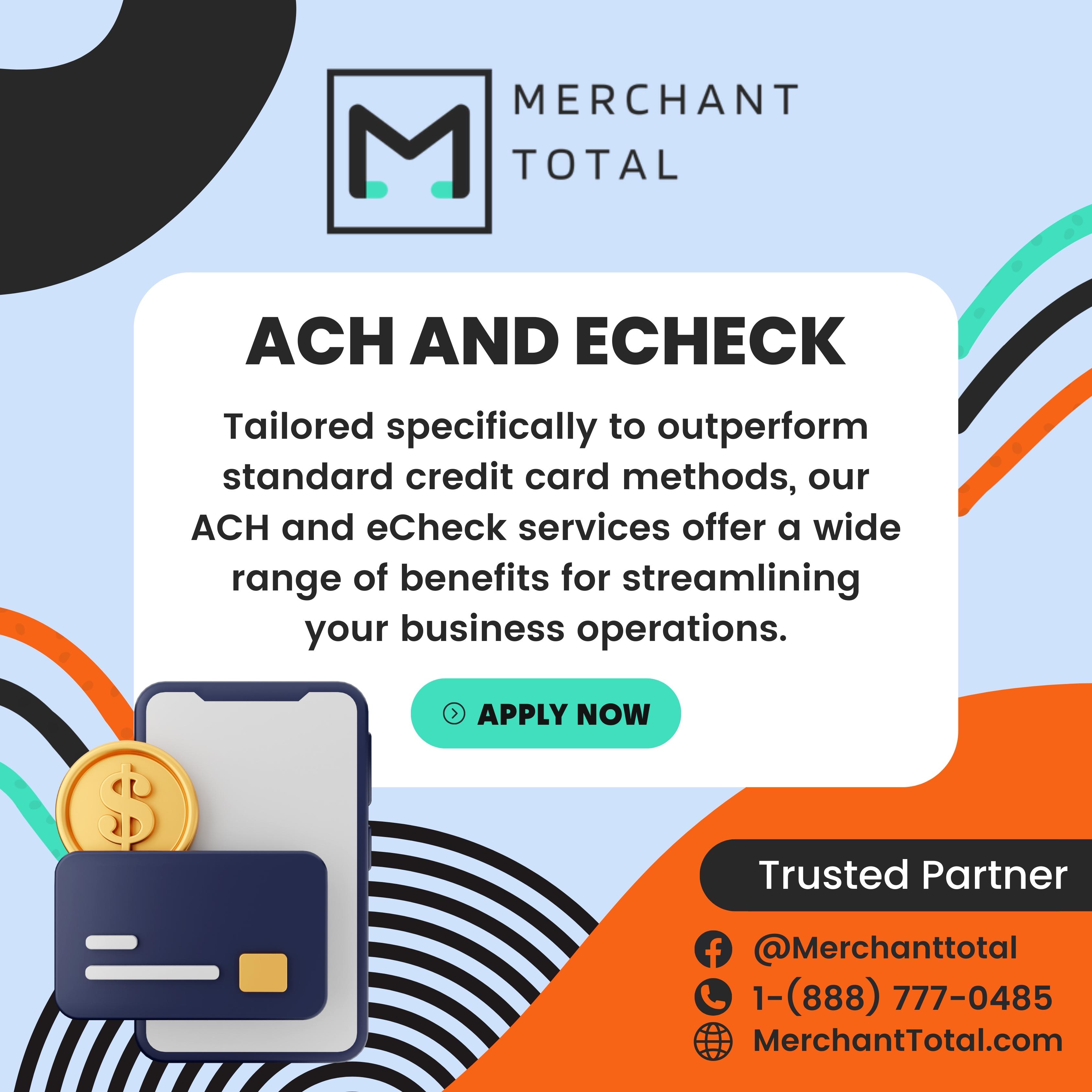 LAWRENCEVILLE, GEORGIA, UNITED STATES, January 10, 2024 /EINPresswire.com/ -- Merchant Total is proud to announce the expansion of its Automated Clearing House (ACH) services, now uniquely tailored for businesses in high-risk sectors. This significant enhancement is part of Merchant Total's ongoing commitment to provide specialized, secure, and efficient financial solutions for industries that encounter unique transactional challenges.