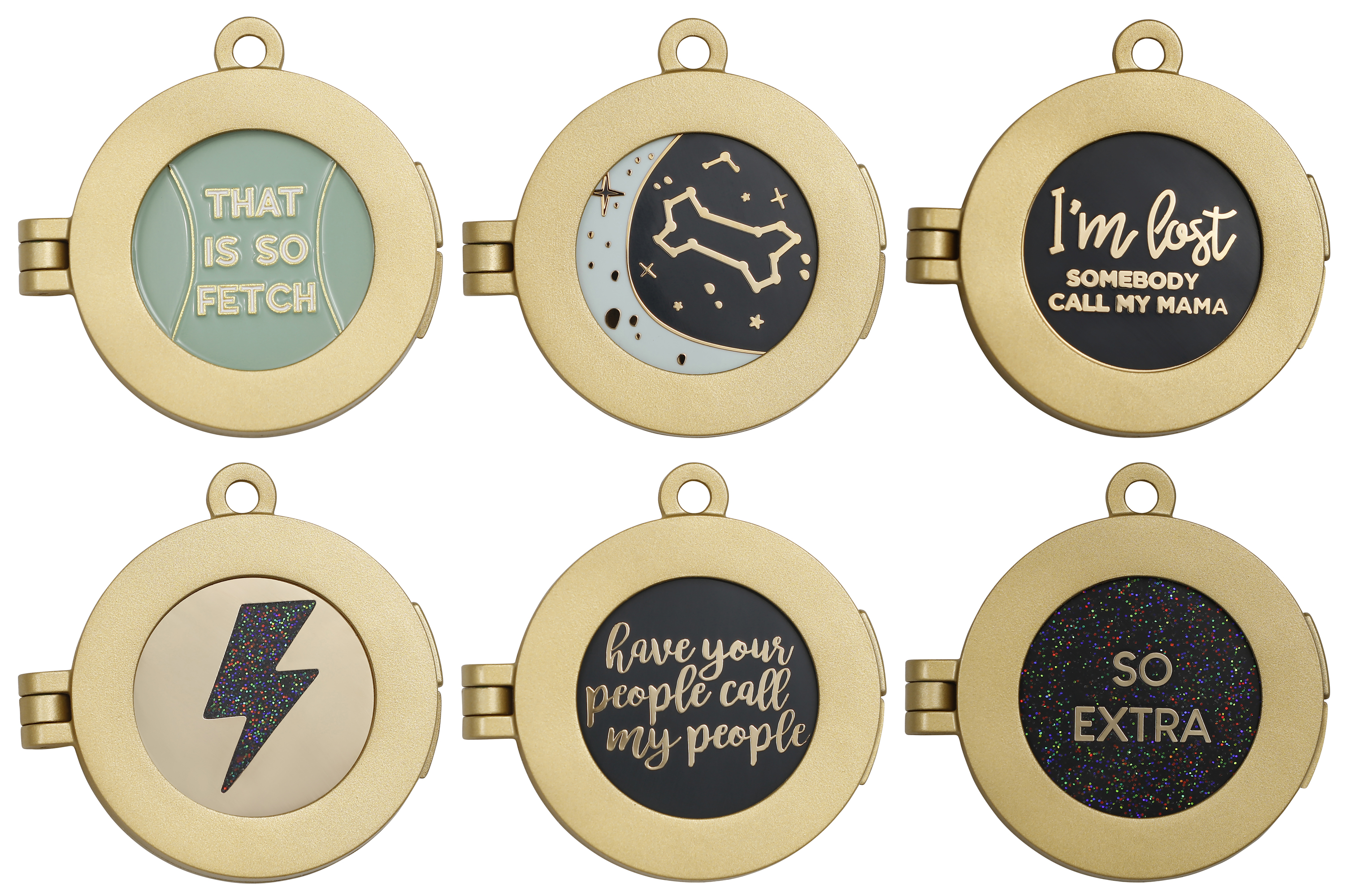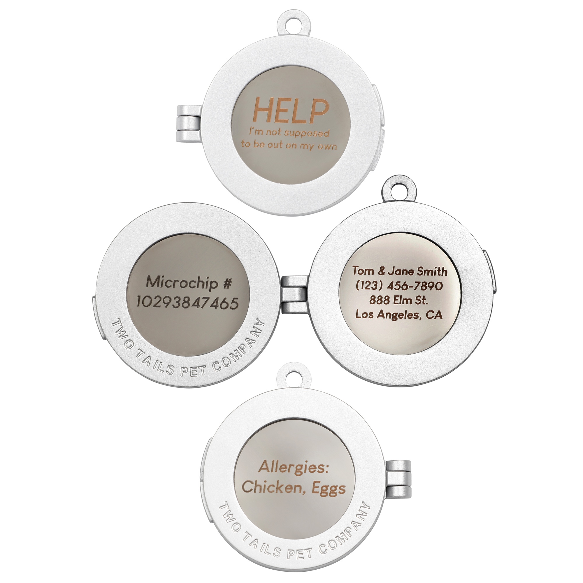 Also good news for Two Tails customers, the Pet ID Tag Locket seamlessly integrates with Two Tails' existing collection of round enamel ID tags, offering a modern and trendy aesthetic you can build on. These enamel ID tags are available in dozens of cute designs, come with laser-engraved information that won't fade, and can accommodate up to four lines of vital details.