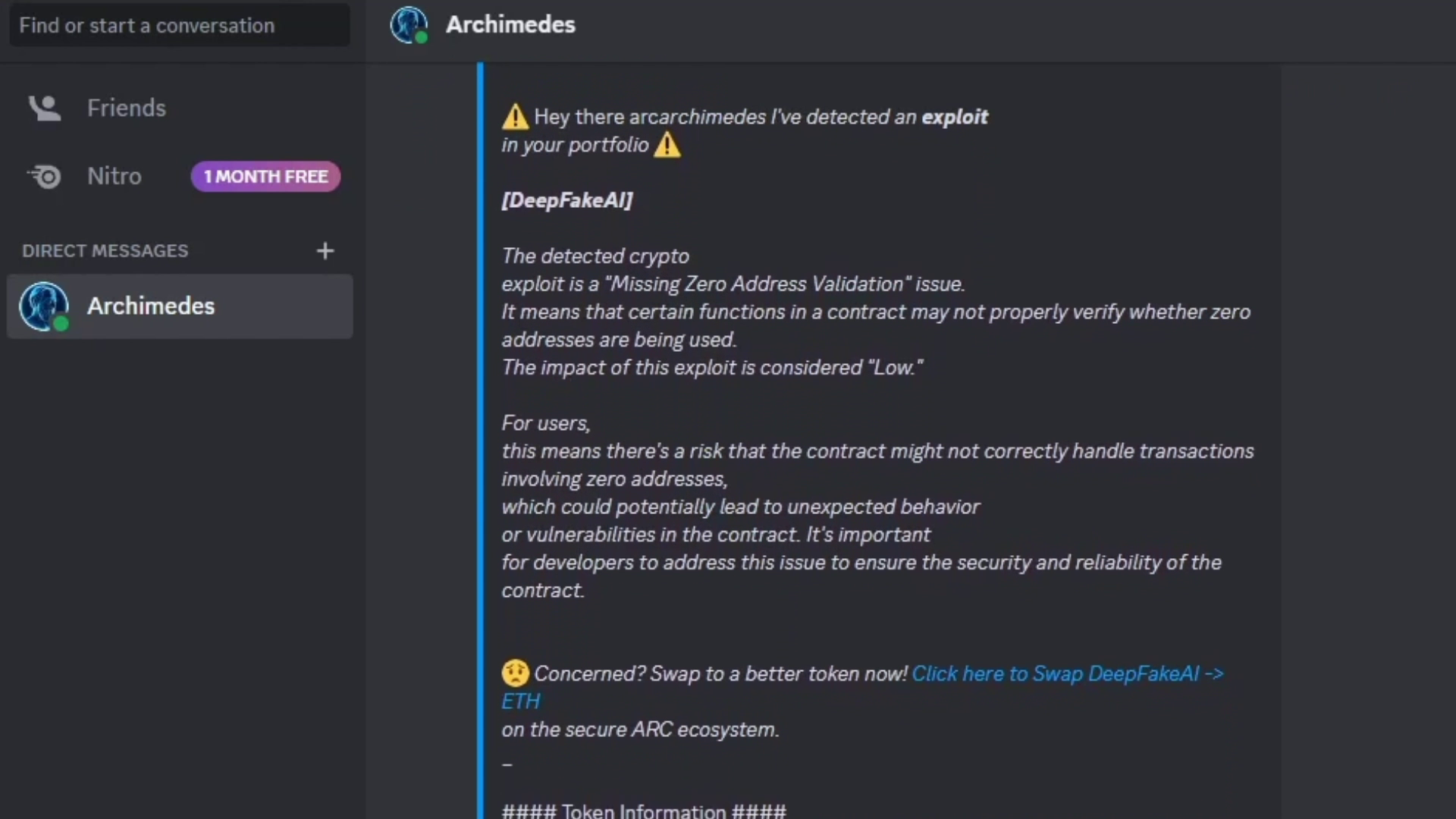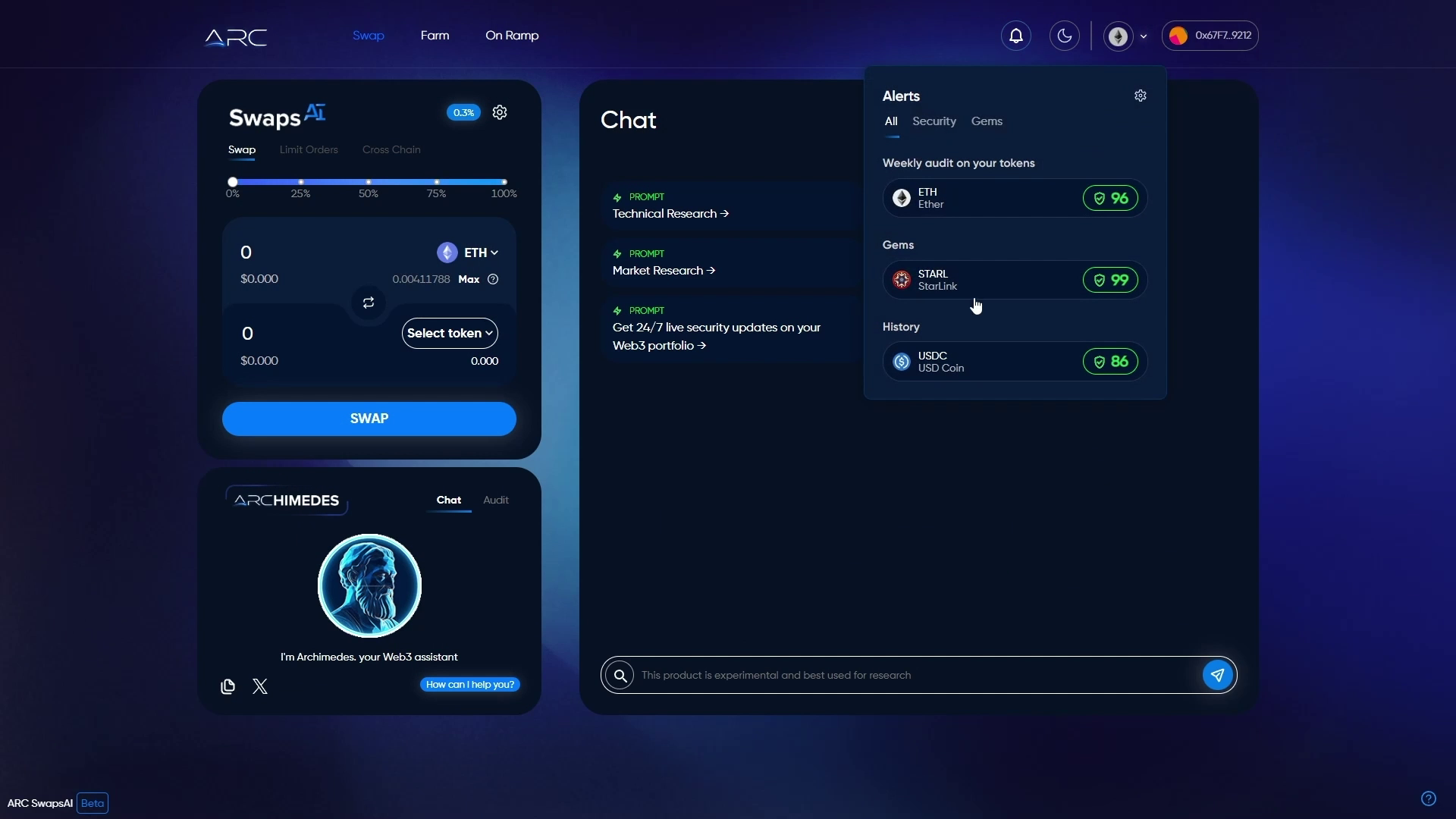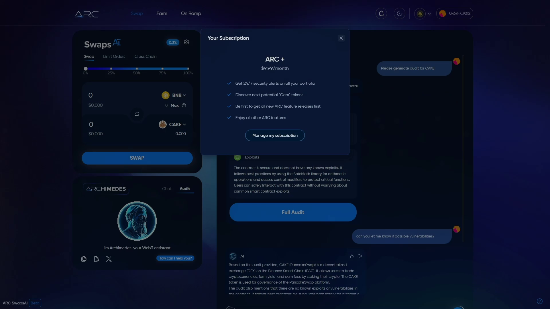 In the digital asset domain, security holds paramount importance. ARC+ addresses this need by offering continuous portfolio monitoring and 24/7 security alerts. These measures enhance white-hat expert-level smart contract safety checks, ensuring robust security for all subscribers. Furthermore, subscribers who integrate their Telegram or Discord accounts will receive Security DMs from Archimedes, enabling interactive chat conversations with the proactive AI. This feature ensures that subscribers are well-informed about potential threats, market shifts, and the structural integrity of their digital assets. Advanced analytics complement these features by providing in-depth insights into market trends and asset performance.