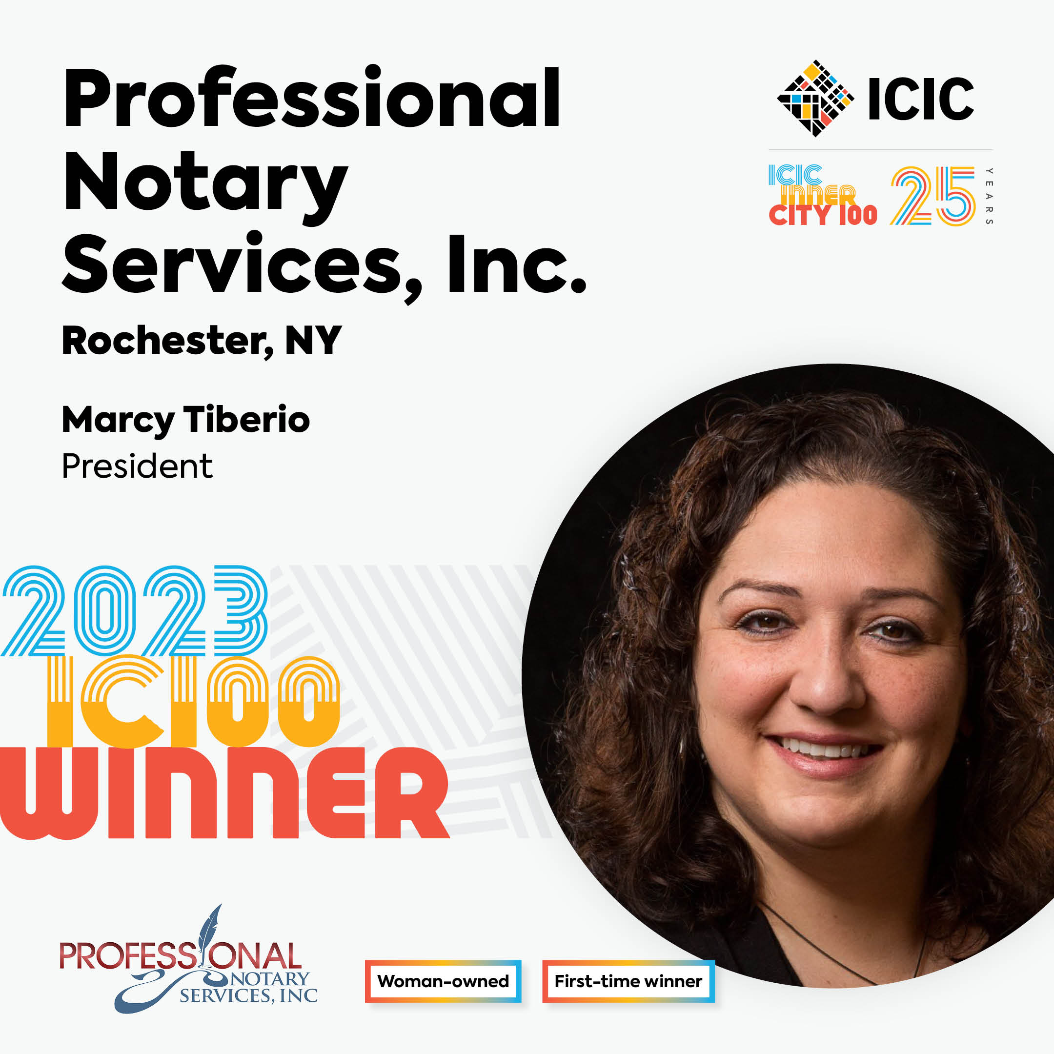 PNS owner, Marcy Tiberio, is especially proud to be among the IC100 winners because the ICIC shared that, “The winners are catalysts of opportunity, optimism, and transformation in under-resourced communities.” Professional Notary Services is often a contributor to fundraisers in the Rochester community and supports a variety of organizations like Bethany House and Veterans Outreach Center. In 2023, PNS celebrated their 10th Anniversary and as a token of gratitude gave away $10,000 to notary-nominated charities. For Christmas 2023, PNS donated three hundred coats to underprivileged children and 250 Christmas stockings. Service to the community is a priority for PNS.