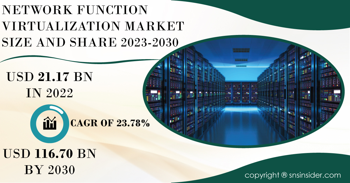 AUSTIN, TEXAS, UNITED STATES, January 12, 2024 /EINPresswire.com/ -- According to SNS Insiderโs research, the growth drivers for the Network Function Virtualization (NFV) Market are multifaceted, encompassing the need for enhanced agility, cost-efficiency, 5G adoption, and the broader shift towards digital transformation.The SNS Insider report indicates that the size of network function virtualization (NFV) market reached USD 21.17 billion in 2022, with a projected growth to USD 116.70 billion by 2030. The expected compound annual growth rate (CAGR) over the forecast period from 2023 to 2030 is 23.78%.