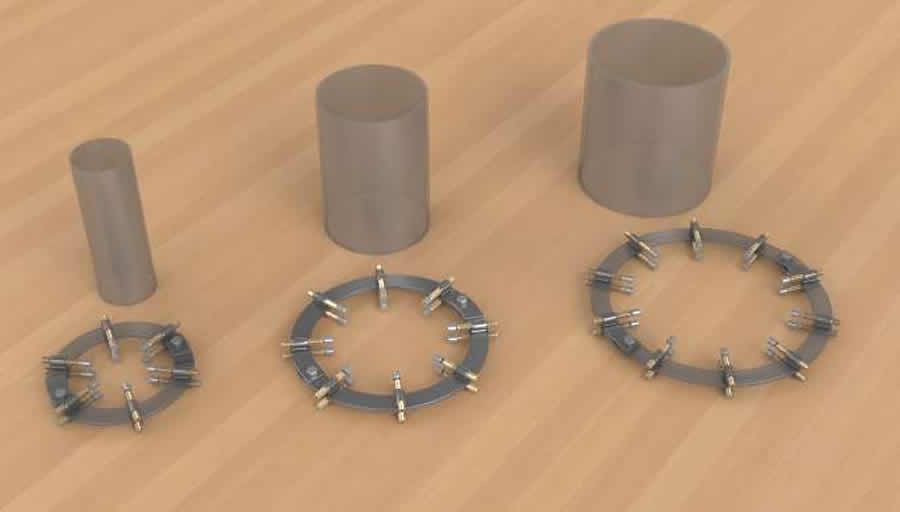 The tool is comprised of 5/8” threaded weld bung fittings that are welded to a steel 1/4" thick steel ring with the bungs evenly spaced around the ring on both sides. The ring is cut on both sides to make the hinge and latch, and flat steel is welded to both sides of one half of the ring for the hinge and latch. There is a 3/8” hole that is drilled for bolting, one for the hinge and one for the latch. Swivel screws are then threaded into the bungs.