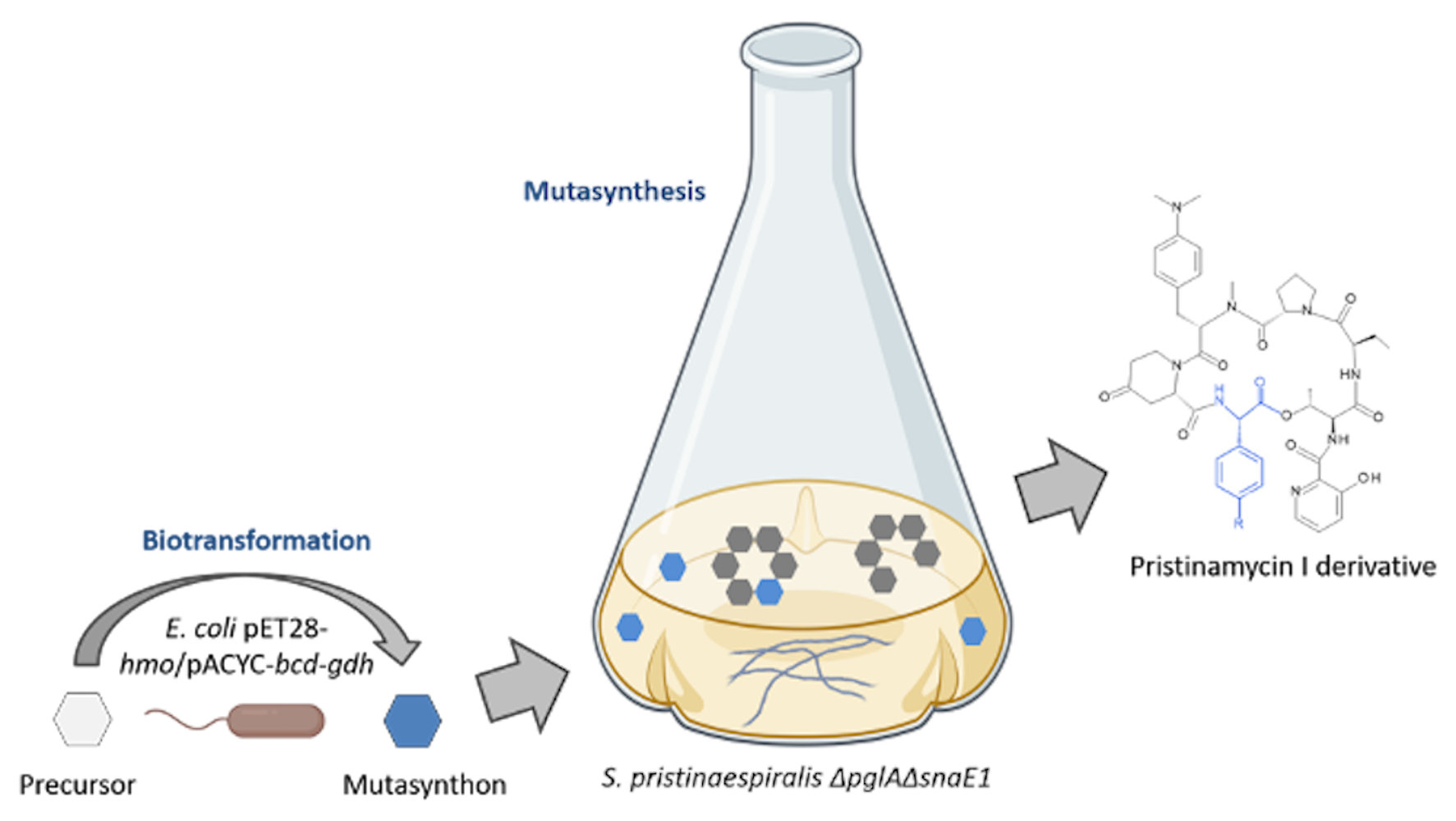 Hennrich O, Weinmann L, Kulik A, Harms K, Klahn P, Youn J-W, Surup F, Mast Y (2023) Biotransformation-coupled mutasynthesis for the generation of novel pristinamycin derivatives by engineering the phenylglycine residue. RSC Chem Biol. 4:1050-1063.