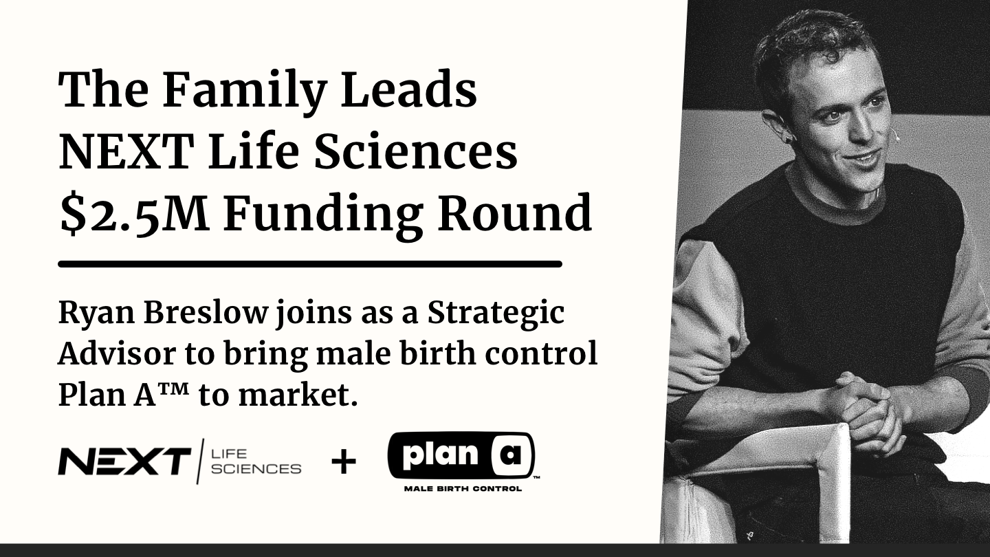 LOS ANGELES, CALIFORNIA, UNITED STATES, January 16, 2024 /EINPresswire.com/ -- NEXT Life Sciences, the maker of the male contraceptive product Plan A™, announced today that it has secured an oversubscribed $2.5M round of funding to help advance its mission of bringing Plan A™ to market. The Family, a high-impact startup accelerator led the round with participation from Transform VC and a combination of angel investors and early-stage Venture funds including entrepreneur Brock Pierce, StartupHealth, Pay It Forward Venture Capital, Particular Ventures, Keno Peer, Unpopular Ventures, and Joy Fund, bringing total seed funding to date to $4M.