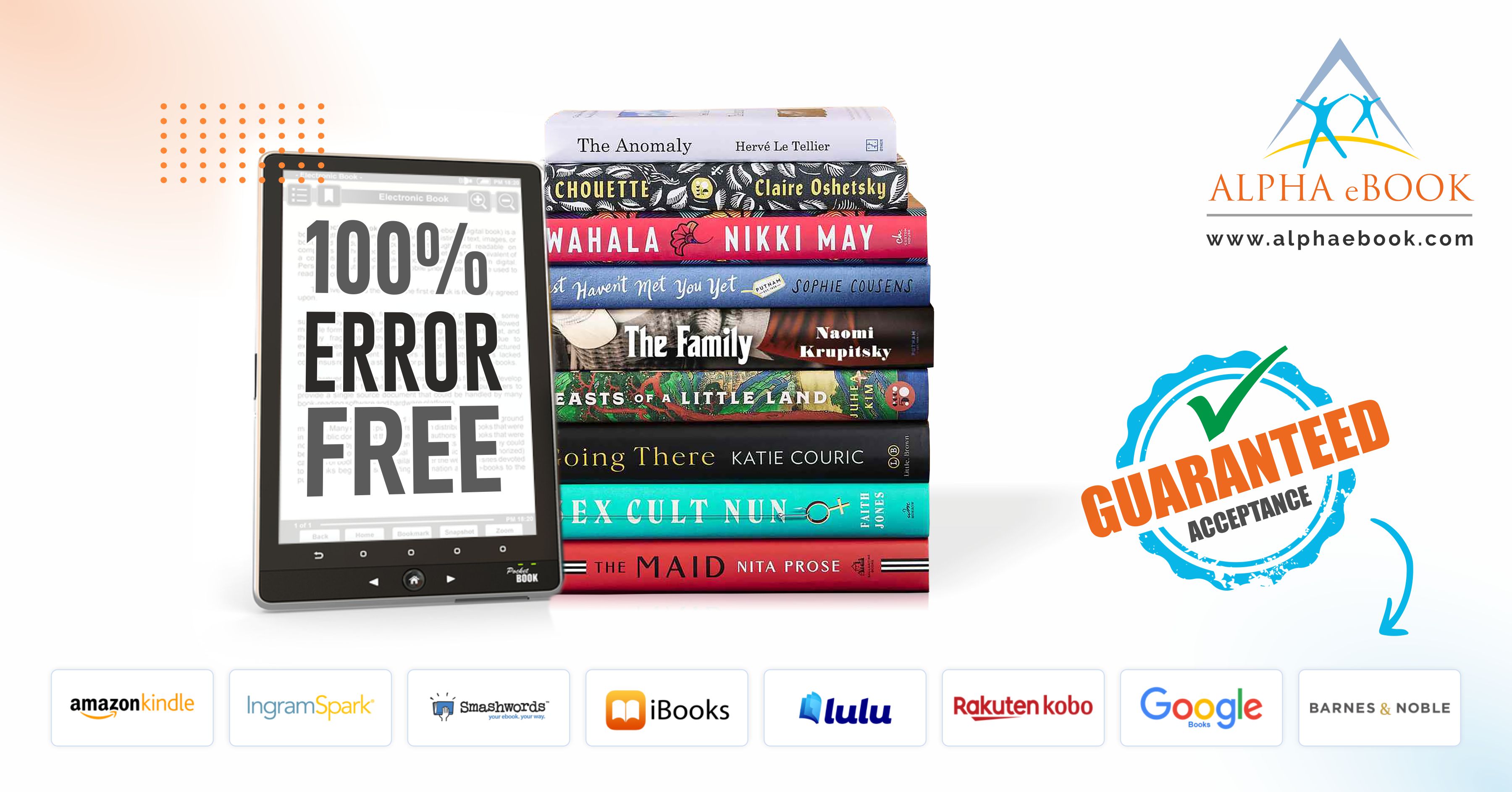Alpha eBook offers error-free ebooks for all publishing platforms, such as Amazon, Google Books, iBooks, B&N, Smashwords, and more.