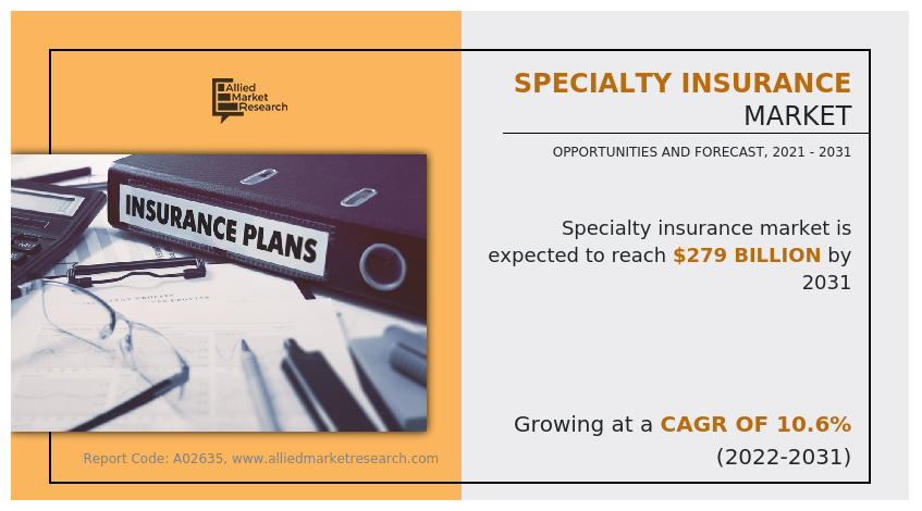 Allied Market Research published a report, titled, "Specialty Insurance Market by Type (Marine, Aviation and Transport (MAT) Insurance, Political Risk and Credit Insurance, Entertainment Insurance, Art Insurance, Livestock and Aquaculture Insurance, Others), by Distribution Channel (Brokers, Non-brokers), by End User (Business, Individuals): Global Opportunity Analysis and Industry Forecast, 2021-2031". According to the report, the global specialty insurance industry generated $104.7 billion in 2021, and is anticipated to generate $279.0 billion by 2031, witnessing a CAGR of 10.6% from 2022 to 2031.