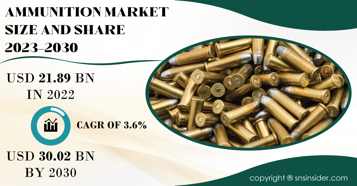 The SNS Insider report indicates that the Ammunition Market was valued at USD 21.89 billion in 2022, and it is projected to achieve a market size of USD 30.02 billion by 2030, with a compound annual growth rate (CAGR) of 3.6% expected over the forecast period from 2023 to 2030.