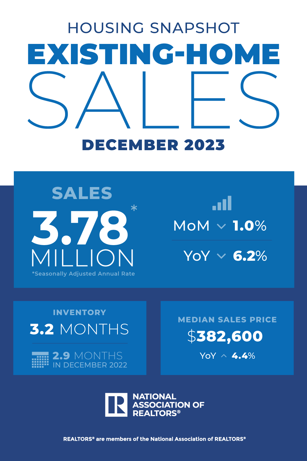 - Existing-home sales waned 1.0% in December to a seasonally adjusted annual rate of 3.78 million. Sales faded 6.2% from the previous year. The median existing-home sales price rose 4.4% from December 2022 to $382,600 – the sixth consecutive month of year-over-year price increases.