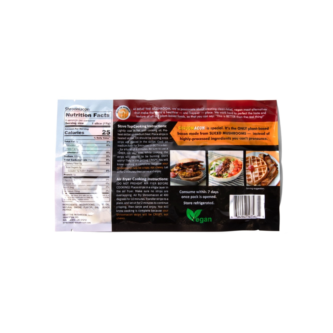 “Believe it or not, I created Shroomacon by accident! After seeing how impactful switching to a plant-based diet was on my health, I had a revelation. I wanted to open a restaurant, and while creating the recipe for meat alternatives that didn't use soy, I created Shroomacon. Bacon was one of the hardest and last things I gave up on my journey to veganism. Being able to give fellow vegans, vegetarians, and healthy eaters a taste rivaling pork bacon without all the bad stuff is exciting.” - Marvin Montague Jr.