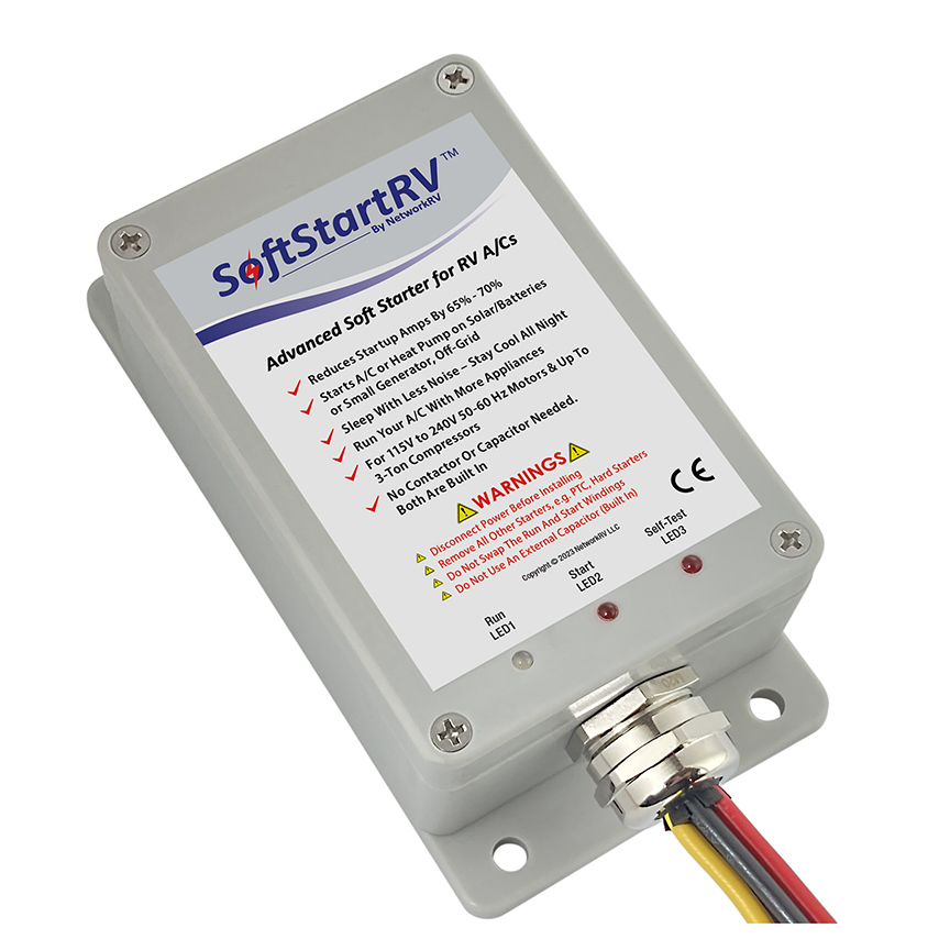 Because RV air conditioner/heat pump units require a startup power spike that exceeds most RV solar power system specs, most RV A/C-heat pump unitss can’t be powered through standard inverters. However, that isn’t the case with this breakthrough solar kit. To assure that the SoftStartRV Solar Kit delivers at-home comfort like no other, it includes a SoftStartRV soft starter that connects directly to the rooftop A/C-heat pump unit. This reduces the startup power demand of a typical RV A/C unit by up to 70%. As a result, instead of spending thousands more on a larger solar power kit just to meet the A/C’s high startup demand – or worse, going without cool comfort inside the RV – the SoftStartRV Solar Kit enables the solar-charged system to work flawlessly with the A/C-heat pump no matter where the RV travels.