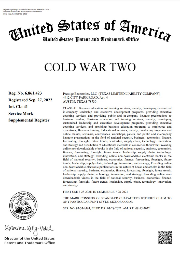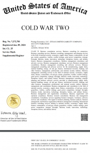 Prestige Economics has been awarded U.S. trademarks for Cold War Two® in International Classes 9, 16, 35, and 41 from the USPTO.