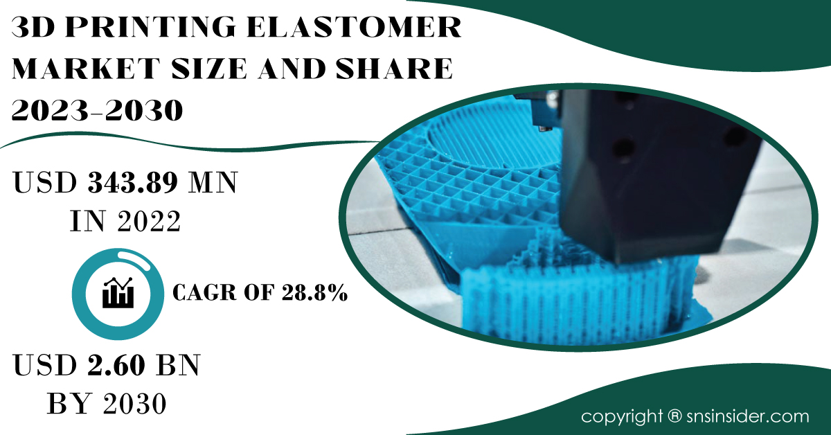 The SNS Insider report indicates that the 𝟑𝐃 𝐏𝐫𝐢𝐧𝐭𝐢𝐧𝐠 𝐄𝐥𝐚𝐬𝐭𝐨𝐦𝐞𝐫𝐬 Market is evaluated to be worth USD 343.89 million in 2022 and USD 2.60 billion by 2030, with a CAGR of 28.8% from 2023 to 2030.