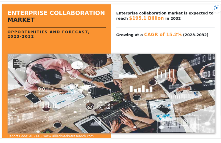 PORTLAND, PORTLAND, OR, UNITED STATE, January 22, 2024 /EINPresswire.com/ -- Allied Market Research published a new report, titled, " The USD 195.1 Billion Enterprise Collaboration Market Reach by 2032 | Top Players such as - Salesforce, Meta & Adobe." The report offers an extensive analysis of key growth strategies, drivers, opportunities, key segment, Porter’s Five Forces analysis, and competitive landscape. This study is a helpful source of information for market players, investors, VPs, stakeholders, and new entrants to gain thorough understanding of the industry and determine steps to be taken to gain competitive advantage.