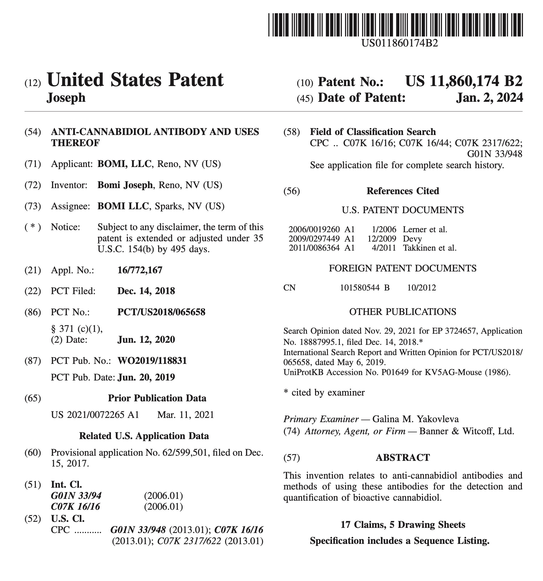 LAS VEGAS, NEVADA, USA, January 23, 2024 /EINPresswire.com/ -- BOMI LLC, a Nevada LLC, announces the issuance of USPTO Patent# 11,860,174 for an anti-cannabidiol antibody which highly selectively binds cannabidiol (CBD), and not other cannabinoids.