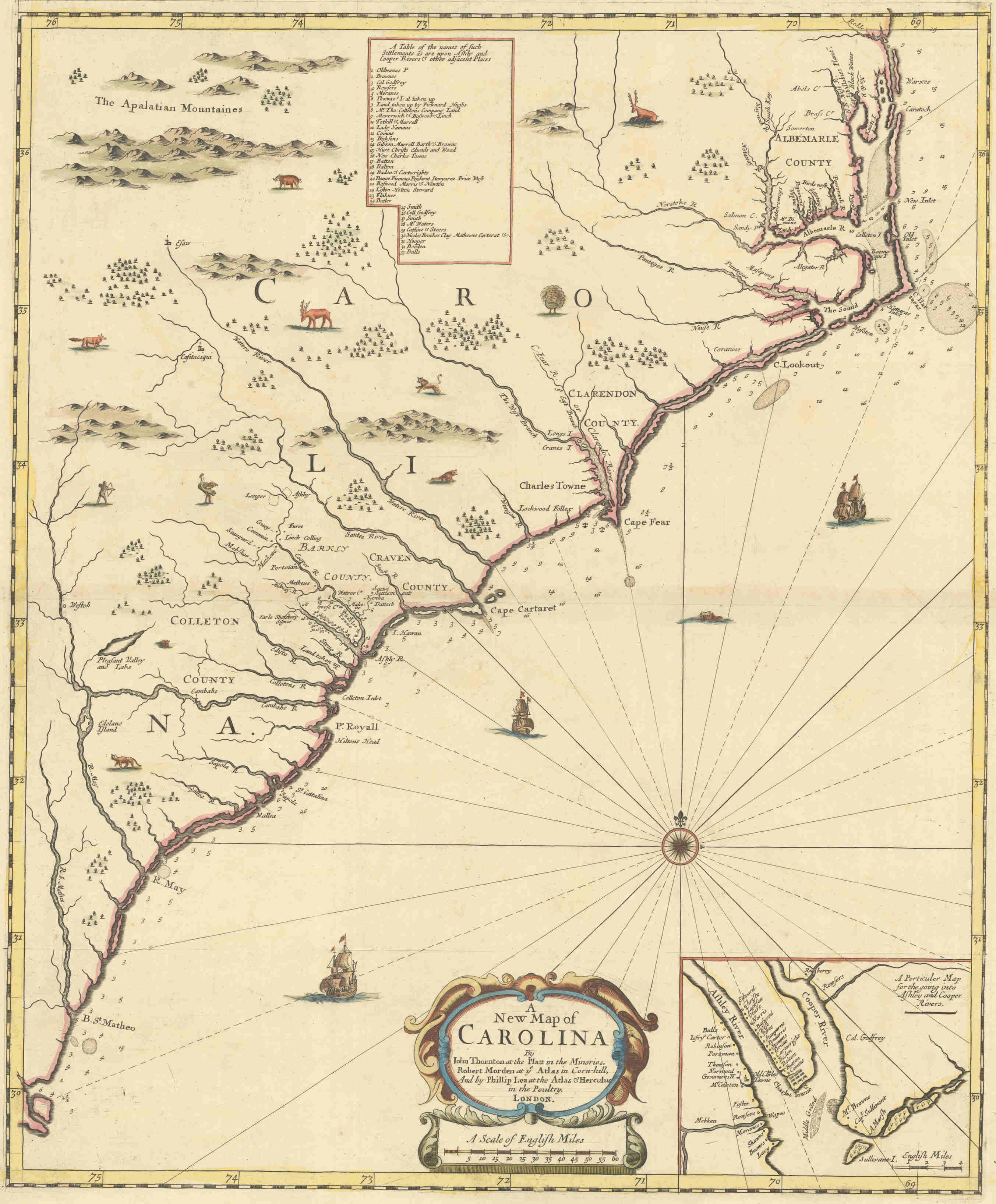 Lot 161 is A New Discription of Carolina by Order of the Lords Proprietors by Moxon/Ogilby (1673), Ogilby's scarce and influential First Lords Proprietors map. Much of the nomenclature on the map represents the names of the Lords Proprietors, who were granted control of the region by Charles II in the hopes of creating a new colony. Estimate: $9,000 - $11,000.