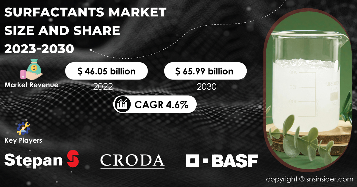 The Surfactants Market, valued at USD 46.05 billion in 2022, is projected to reach USD 65.99 billion by 2030, with a 4.6% CAGR during 2023-2030
