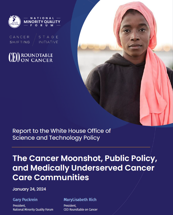 CARY, NORTH CAROLINA, UNITED STATES, January 24, 2024 /EINPresswire.com/ -- The National Minority Quality Forum (NMQF) and CEO Roundtable on Cancer (CEORT) held a crucial press conference today in the nation’s capital unveiling a comprehensive report submitted to the Cancer Moonshot team at the White House Office of Technology. The report, entitled "Cancer Moonshot, Public Policy, and Medically Underserved Cancer Care Communities," raises a national alarm about disparities in cancer risk, screening, prevalence and mortality prevalent in medically underserved communities across the United States.