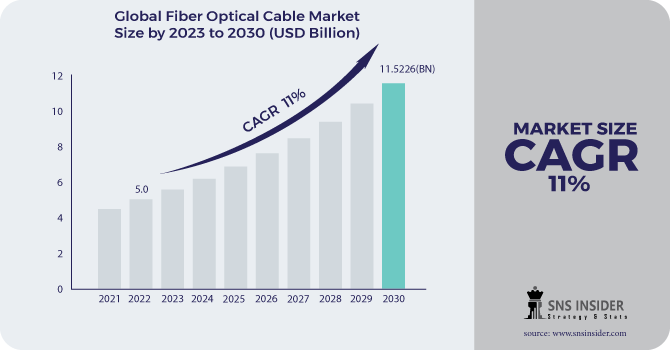 โThe Fiber Optical Cable Market was valued at USD 5 billion in 2022 and is anticipated to reach USD 11.5226 billion by 2030. This represents a consistent Compound Annual Growth Rate (CAGR) of 11% during the forecast period from 2023 to 2030โ