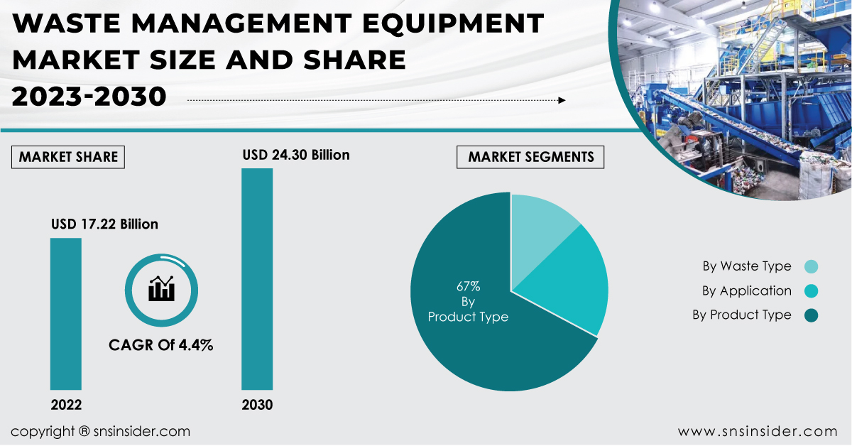 The SNS Insider report reveals that the Waste Management Equipment Market, valued at USD 17.22 billion in 2022, is set to reach USD 24.30 billion by 2030, exhibiting a commendable CAGR of 4.4% during the forecast period from 2023 to 2030.