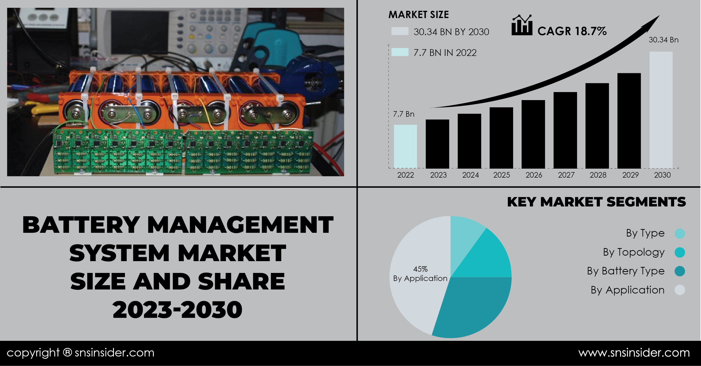 AUSTIN, TEXAS, UNITED STATES, January 29, 2024 /EINPresswire.com/ -- Market Report Scope & OverviewThe Battery Management System Market was valued at USD 7.7 billion in 2022 and is projected to grow to USD 30.34 billion by 2030. This indicates a robust Compound Annual Growth Rate (CAGR) of 18.7% over the forecast period from 2023 to 2030.