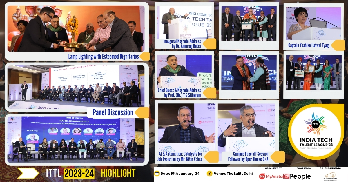 BENGALURU, KARNATAKA, INDIA , January 30, 2024 /EINPresswire.com/ -- The ITTL’23-24 emerged as a significant platform showcasing technology's transformative impact on industries in Delhi, a vibrant hub with a rich history contributing unique flavors to the tech landscape. The event served as a convergence point for academia, industry, and government, bringing together professionals, CEOs, CXOs, Chancellors, Directors, and Startups to collaboratively address talent dynamics and disruptive technologies, devising groundbreaking solutions. The dynamic transformation of India's technology landscape was notable, driven by global economic changes, innovative advancements, and evolving work patterns, with a core emphasis on the potent combination of AI & Automation for enhanced efficiency, cost benefits, and decision-making capabilities.The India Tech Talent League 2023, the highlight of this extravaganza, is organised by MyAnatomy, co-organized by ISF and powered by BW People. It forges strong connections with T-Hub as the Knowledge Partner, TASK (Telangana Academy for Skill and Knowledge) as the Skilling Partner, Chitkara as the University Partner, CEED as the Innovation Partner, Artificial Intelligence and Innovation Driven Entrepreneurship – CoE as AI Innovation Partner and Ontropi as the Startup Ecosystem Partner—all collaborating with a shared mission to create an environment that offers equal opportunities for tech talent.
