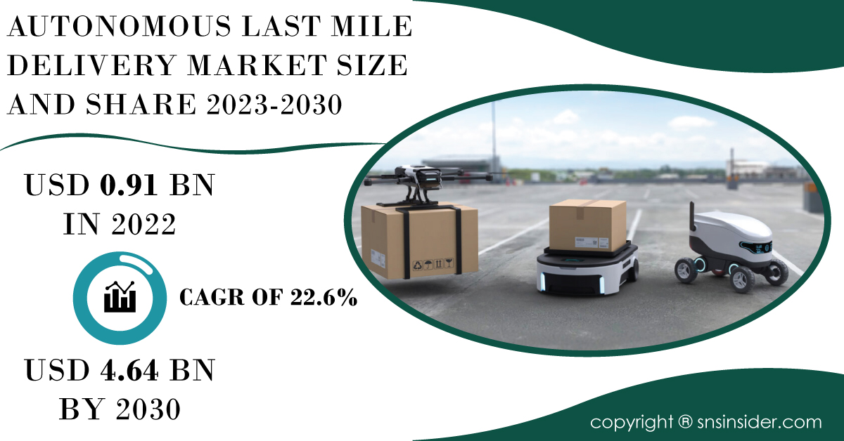 AUSTIN, TEXAS, UNITED STATES, January 30, 2024 /EINPresswire.com/ -- ๐๐๐ซ๐ค๐๐ญ ๐๐๐ฉ๐จ๐ซ๐ญ ๐๐๐จ๐ฉ๐ & ๐๐ฏ๐๐ซ๐ฏ๐ข๐๐ฐThe Autonomous Last Mile Delivery Market achieved a valuation of USD 0.91 billion in 2022 and is projected to grow to USD 4.64 billion by 2030. This signifies a substantial Compound Annual Growth Rate (CAGR) of 22.6% over the forecast period from 2023 to 2030.