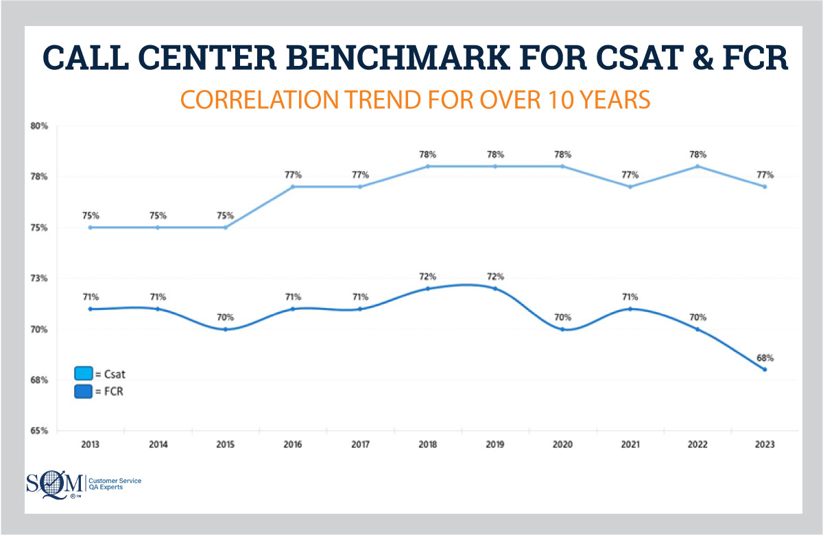 For 2023, the call center benchmark for the Csat score is 77% and remains relatively the same for the last 5 years. The Csat score represents the very satisfied customers (top box survey rating response) with the call center's overall customer service. The call center benchmark industry for First Call Resolution (FCR) score is 68% for 2023, down 4% since COVID-19.