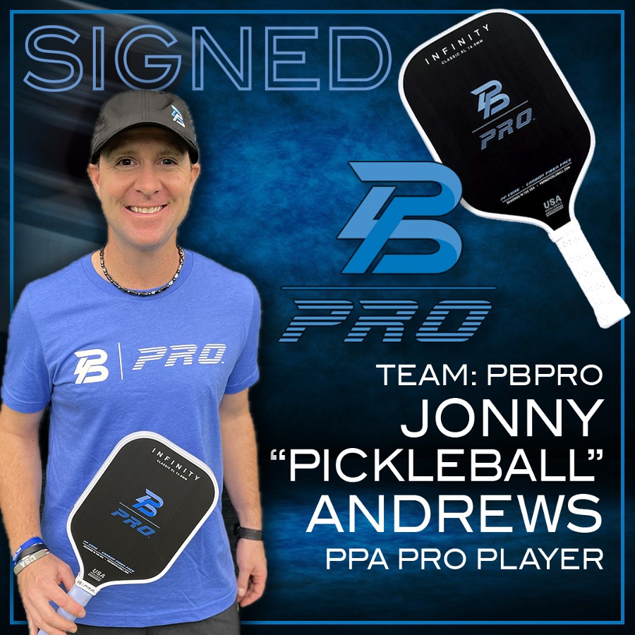 CHARLOTTE, NC, USA, January 30, 2024 /EINPresswire.com/ -- PBPRO®, a professional pickleball brand featuring professional paddles, coordinated apparel and accessories, has signed pickleball pioneer Jonny Andrews, widely known as “Jonny Pickleball,” the company announced today.Andrews, who is the Director of Pro Pickleball Association (PPA) Camps, is the first professional player deal signed by PBPRO® and signals the next step in the growth for the pickleball brand founded in October 2020 by former professional tennis player Simona Galik Moore.