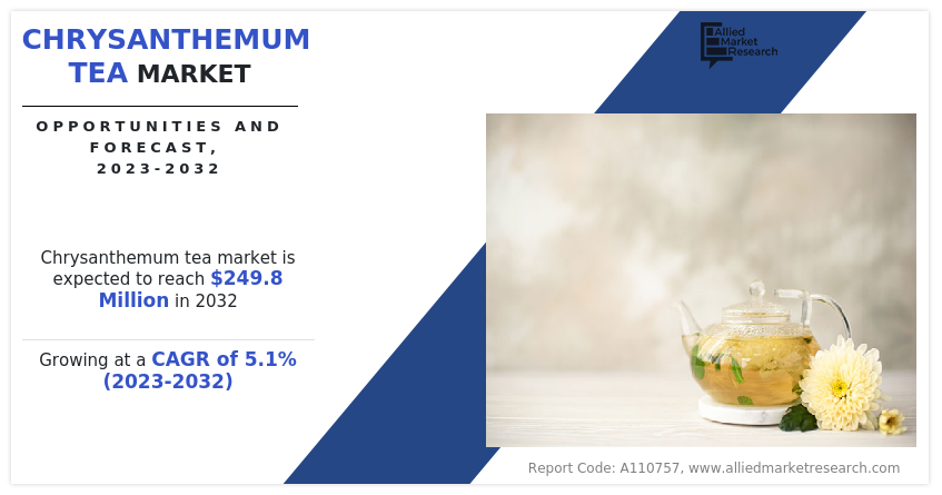 PORTLAND, OR, UNITED STATES, January 31, 2024 /EINPresswire.com/ -- According to a new report published by Allied Market Research, titled, “Global Chrysanthemum Tea Market by Type, Packaging, Application, and Distribution Channel: Global Opportunity Analysis and Industry Forecast, 2023–2032,” the global chrysanthemum tea market was valued at $153.1 million in 2022, and is projected to reach $249.8 million by 2032, registering a CAGR of 5.1% from 2023 to 2032.