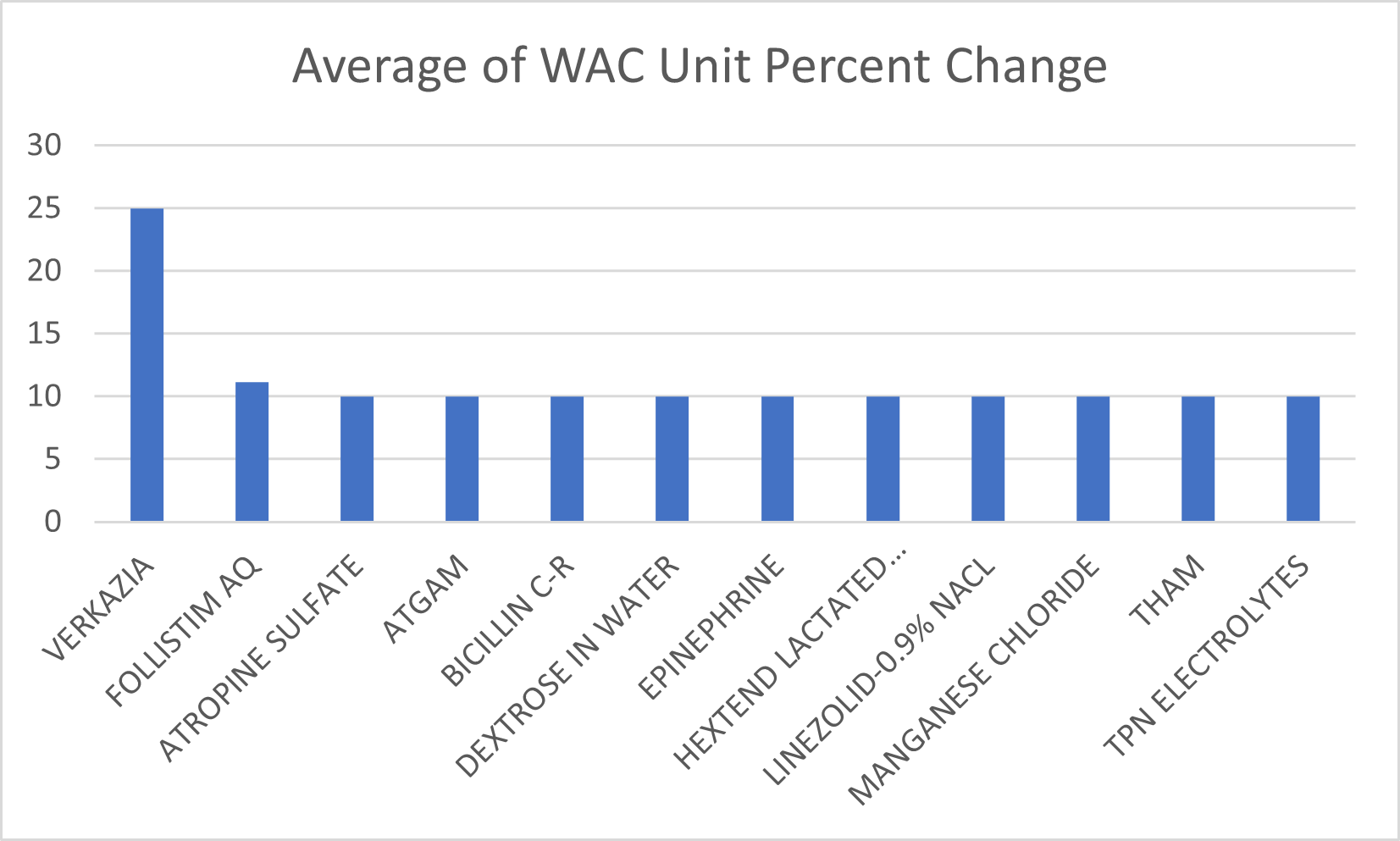 The largest WAC unit increase since January 8 was applied to the product VERKAZIA. This is a product manufactured by Eyevance/Harrow for the treatment of acute vernal keratoconjunctivitis. This is the first list price increase that this product has taken since 2022. Meanwhile, the smallest increase was attributed to Novartis’ LEQVIO, with a 1.25% increase. LEQVIO is a Small Interfering RNA Agent, that last took a WAC unit price increase of 1.25% in July 2023. Thus far in 2024, Incyte Corporation’s JAKAFI still has the lowest WAC unit price increase for the new year, with their 0.76% list price increase posted prior to our latest press release.