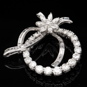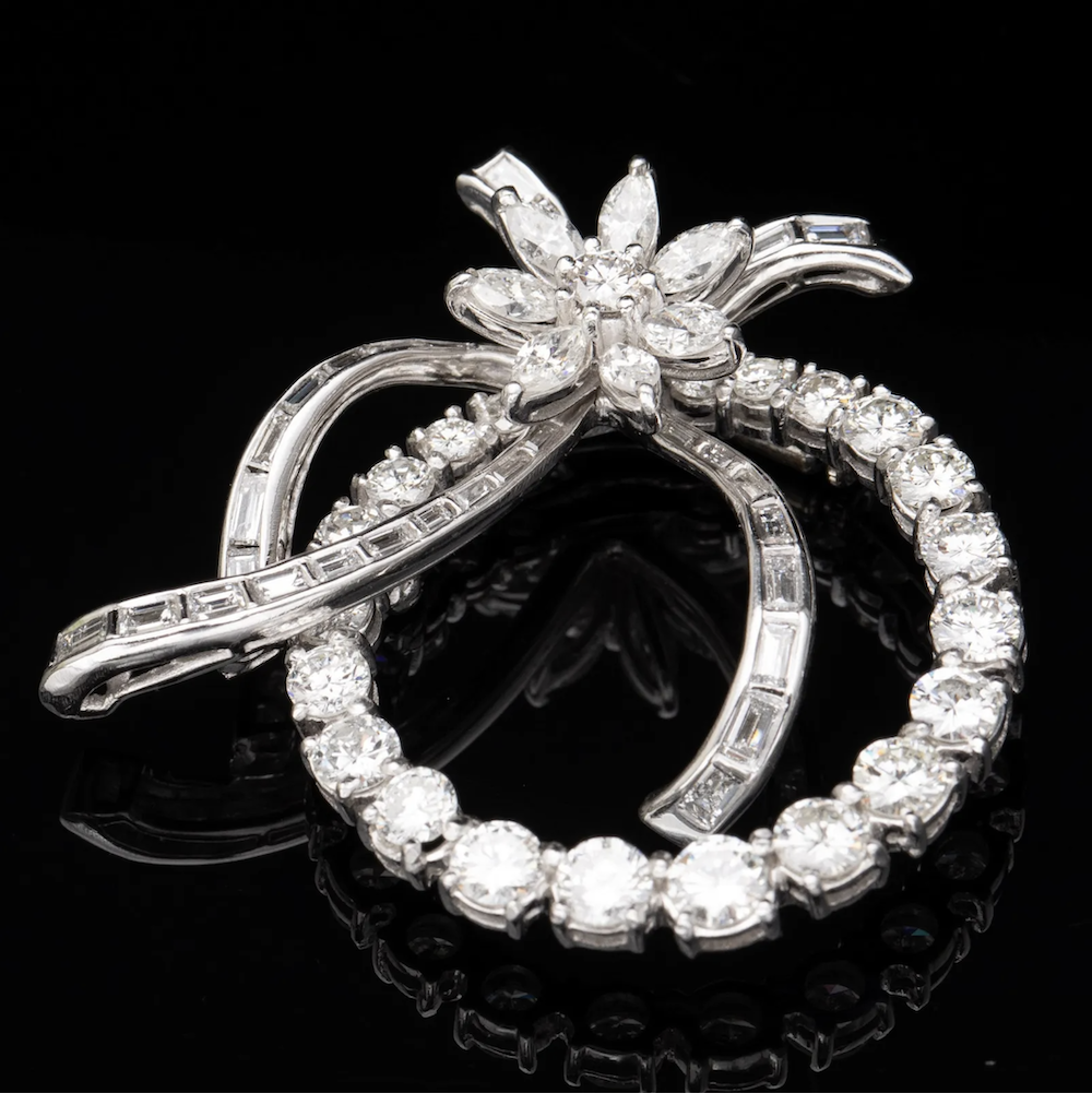 The Fine Jewelry section is led by a fabulous 4.7ct brilliant-cut diamond and platinum solitaire engagement ring from the Estate of Jeannie Sims of Savannah (Ga.) and Charleston (S.C.). Graded O/P color and SL1 clarity, the diamond is set in a six-prong Tiffany-style mounting. It is accompanied by a GIA diamond grading report; the diamond is laser-inscribed with the GIA lab report number. This exquisite sparkler is estimated at $25,000-$40,000. Another elegant selection from the Sims estate is a diamond and platinum (tested) brooch designed as a circle pin entwined with a bow. It features 22 round brilliant-cut diamonds, 6 marquise-cut diamonds and 32 diamond baguettes. Estimate: $8,000-$12,000.