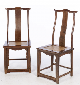 Pair of Chinese yoke-back huanghuali side chairs, Qing Dynasty, 17th century. Estimate: $10,000-$15,000