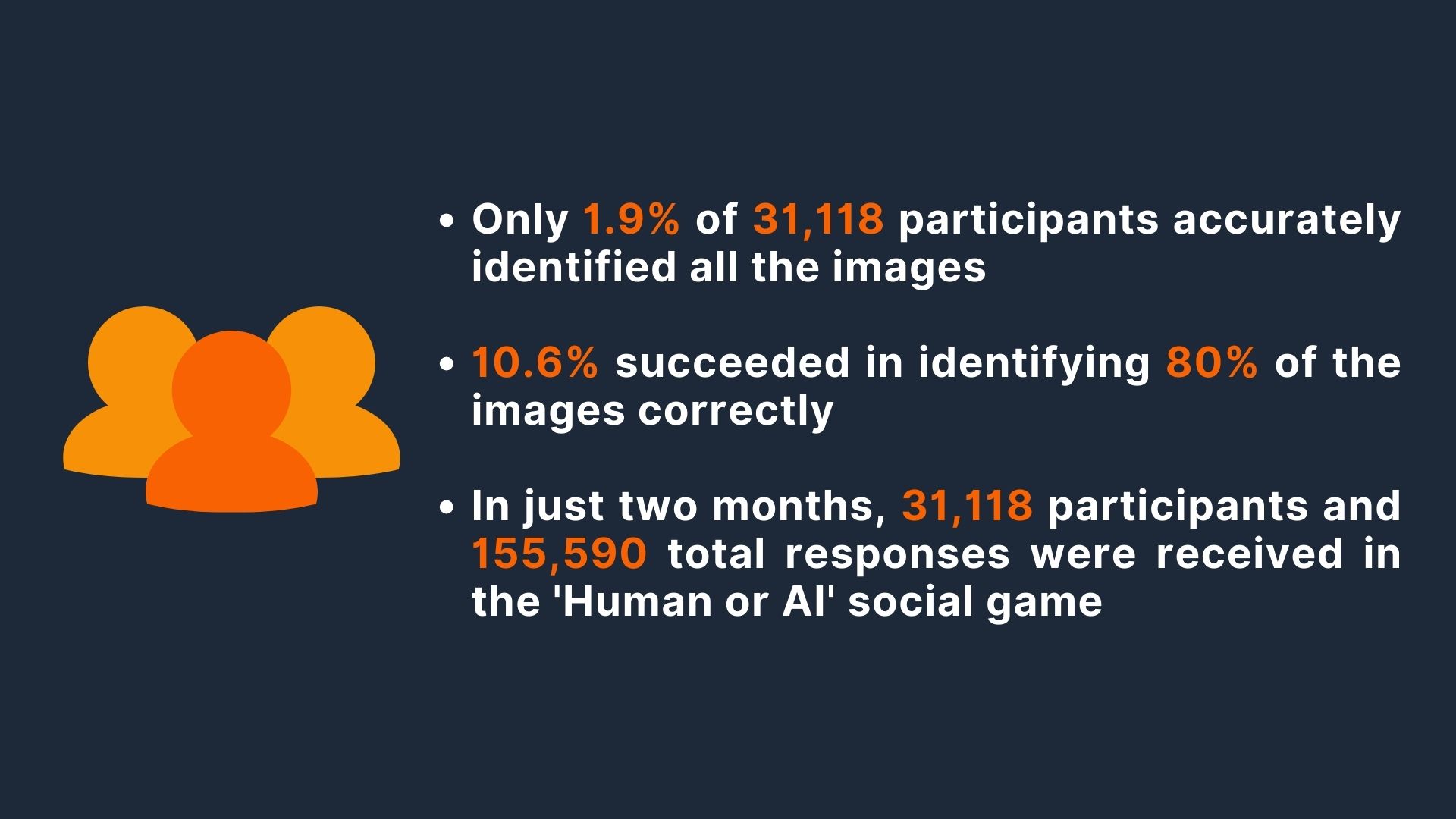 - In just two months, 31,118 participants and 155,590 total responses were received in the 'Human or AI' social game.