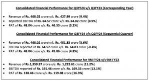 EBIDTA margin for the quarter ending on December 31, 2023 stood at Rs. 64.57 crore as against Rs. 64.83 crore in Q2FY24.