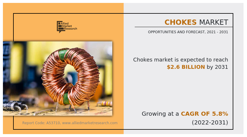 WILMINGTON, DE , UNITED STATES, February 7, 2024 /EINPresswire.com/ -- The global chokes market size was valued at $1.5 billion in 2021, and chokes industry is projected to reach $2.6 billion by 2031, growing at a CAGR of 5.8% from 2022 to 2031.