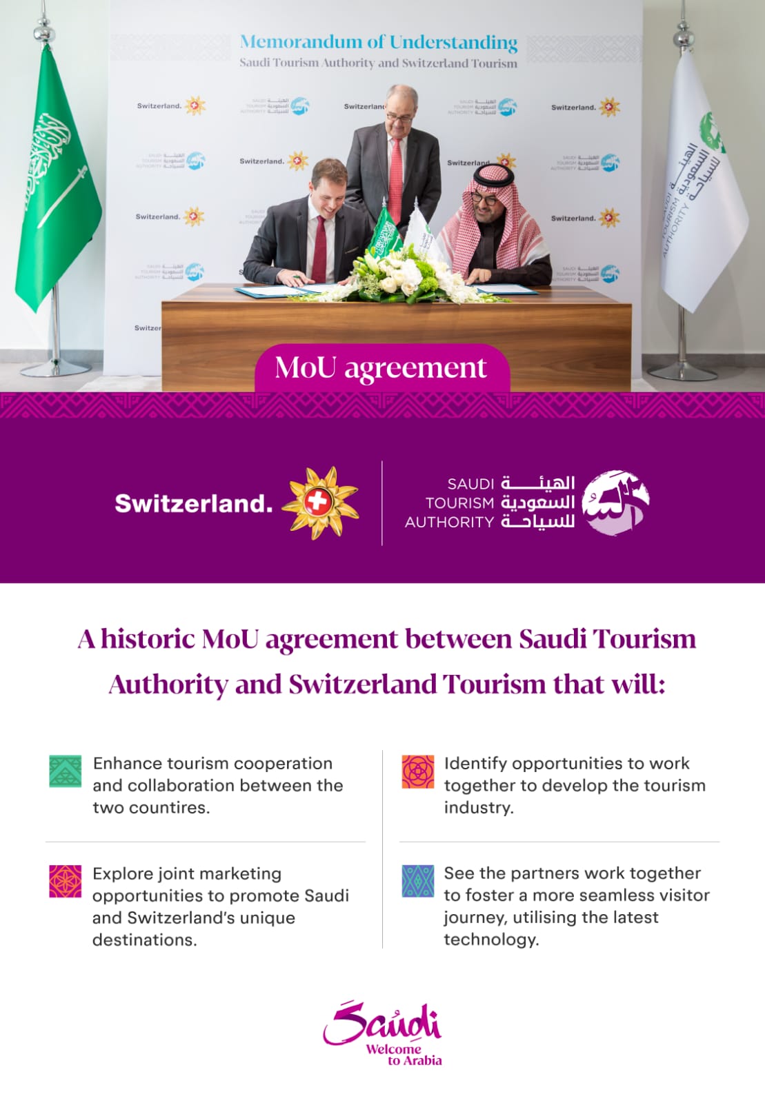 RIYADH, SAUDI ARABIA, February 8, 2024 /EINPresswire.com/ -- In a groundbreaking move, the Saudi Tourism Authority and Switzerland Tourism have forged a strategic partnership to bolster collaboration in the tourism sector. This historic agreement was ceremonially signed at the Saudi Tourism Authority headquarters by Fahd Hamidaddin, CEO and Board Member of the Saudi Tourism Authority, and Livio Gotz, Director GCC at Switzerland Tourism. The ceremony was attended by distinguished guests, including HE Guy Parmelin, Swiss Federal Councillor and Head of Economic Affairs, Education, and Research, along with Yasmine Chatila Zwahlen, the Swiss Ambassador to Saudi Arabia.This MoU, a first-of-its-kind between the two tourism boards, aims to foster the development of the tourism industry, foster mutual promotion, and enable collaborative tourism projects between Saudi Arabia and Switzerland, setting a new precedent for international tourism cooperation. A key aspect of this partnership is the identification of joint marketing initiatives that showcase the unique attractions of each country. Special attention will be given to specialized tourism sectors such as sun and sea, cultural and heritage, and rural tourism, through combined marketing efforts to attract travelers seeking unique experiences. This strategic promotion is intended to boost the visibility and appeal of both Saudi and Switzerland as premier tourist destinations that cater to every traveler.