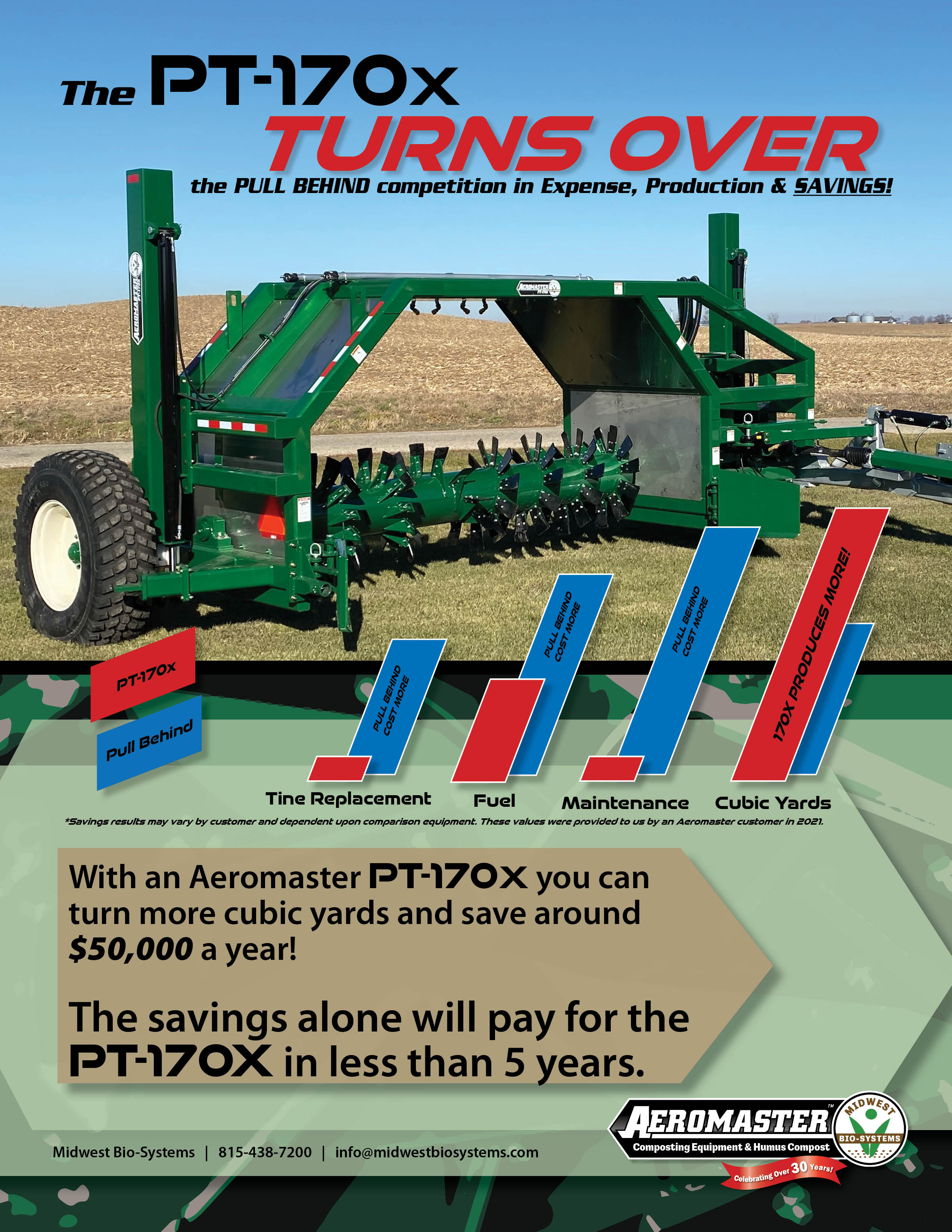 TAMPICO, ILLINOIS, UNITED STATES, February 9, 2024 /EINPresswire.com/ -- Midwest Bio-Systems is introducing the Aeromaster PT-170X pull-type compost windrow turner and is reporting that the reduction in maintenance cost and increased production of the composting machine over five years actually covers the cost of purchasing the equipment.The choice of compost turner size is frequently influenced by limited space considerations, as customers aim to meet volume goals within a smaller-than-ideal area for their compost site. Another key determinant in selecting the turner size is the balance between labor constraints and the target of achieving the maximum tons with the least amount of labor. Opting for larger turners is often driven by the convenience of a truck being able to unload the feedstocks while moving forward to create a windrow. Subsequently, the turner requires minimal loader work to shape the windrows before the initial compost turning process.
