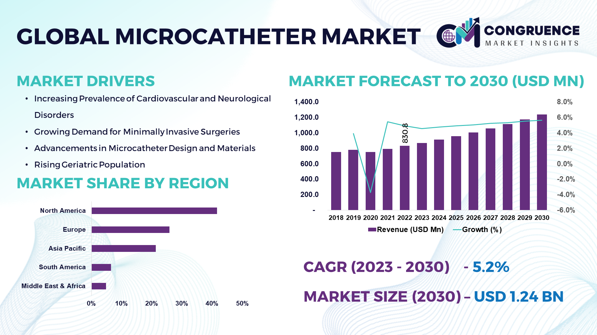 PALO ALTO, UNITED STATES, CALIFORNIA, February 13, 2024 /EINPresswire.com/ --The latest report by Congruence Market Insights, titled 'Global Microcatheter Market – Size, Trends, Share, Growth, Dynamics, Competition, and Opportunity Forecast, 2023 – 2030,' delves into a comprehensive analysis of the global microcatheter market. This report meticulously evaluates both macro and micro trends, offering insights into the dynamic factors shaping the market landscape. It provides a detailed exploration of qualitative and quantitative aspects, delivering precise market size estimations, growth rates, prevailing trends, key drivers, promising opportunities, and potential challenges. Additionally, the report assesses the impact of significant events such as product approvals and regulatory changes, along with external factors like the COVID-19 pandemic, on the microcatheter market. This exhaustive examination equips businesses and stakeholders with invaluable intelligence for strategic decision-making in this evolving market.