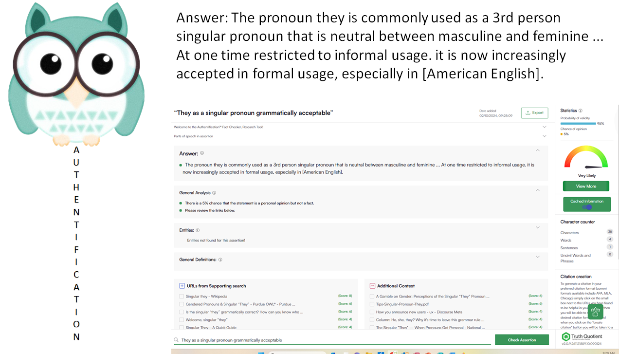 Authentification™ represents a paradigm shift in fact-checking technology, offering users near real-time responses to simple assertions within seconds. With its unique algorithms, Authentification™ scours the internet for top-tier, verifiable information, providing users with validity scores and searchable URLs for every assertion entered, along with comprehensive citations.