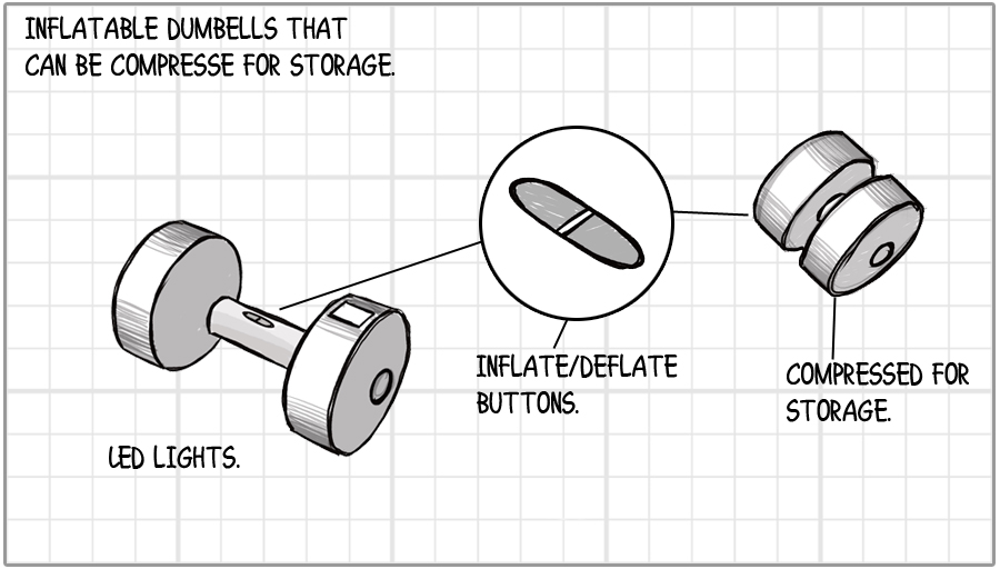 The weights are comprised of dumbbell-style weights with an inflatable air chamber, inflated or deflated via a push button. There are LED lights on the dumbbells for illumination and increasing visibility in dimly lit workout areas. A built-in rep counter shows people how many reps they have done with the dumbbells. Once finished, the user can activate the air release valve to compact the dumbbell for storage. The dumbbell can be placed in a desired storage and/or transportation area. Overall, the inflatable weights offer a more convenient workout tool for exercising at home, while traveling, and more.