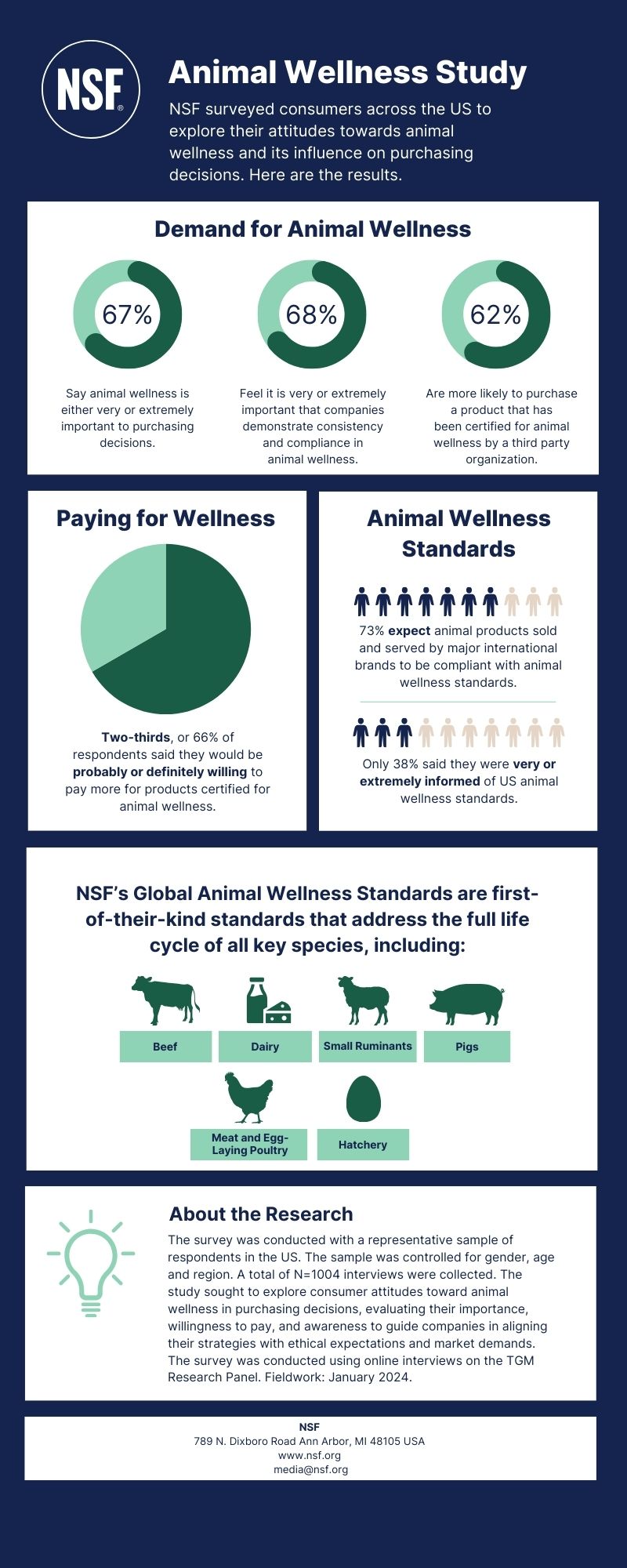“This research makes it clear that the ethical treatment of animals is now a fundamental concern for consumers when making food-related decisions,” said Dr. Elaine Vanier, a veterinarian and the animal wellness program lead for NSF. “Animal wellness plays an important role in the majority of today’s purchasing decisions and brands must prioritize using quality practices across their entire protein supply chain.”