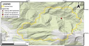 Following extensive research efforts, AM Resources has not conducted any work program on this property yet, but historical drilling has identified the presence of pegmatite bodies bearing spodumene. In addition to spodumene-bearing pegmatites, the Stall claims also host a historical tungsten showing and a former artisanal tungsten underground access.