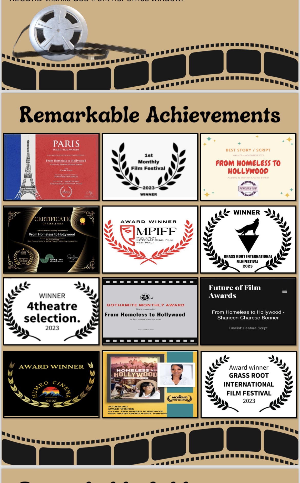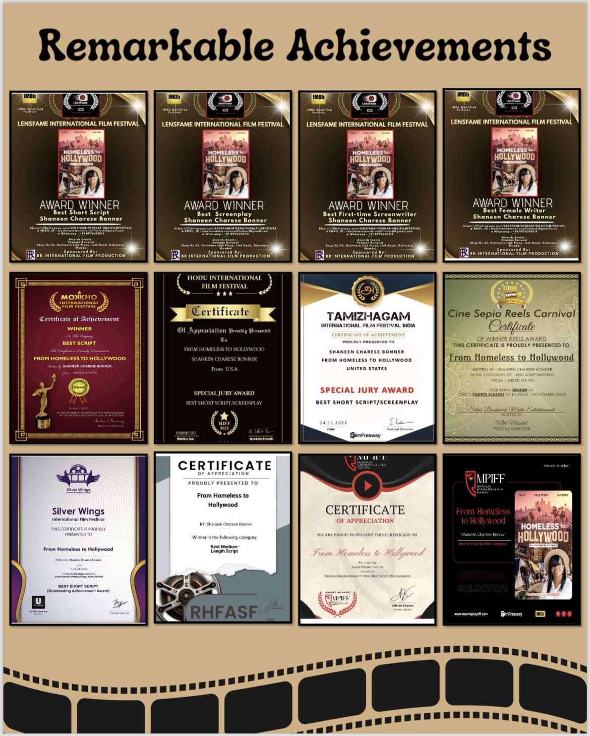 The Multi-Award winner Shaneen Bonner announces her upcoming film script From Homeless To Hollywood. The film script depicts the true story of Shaneen Bonner.