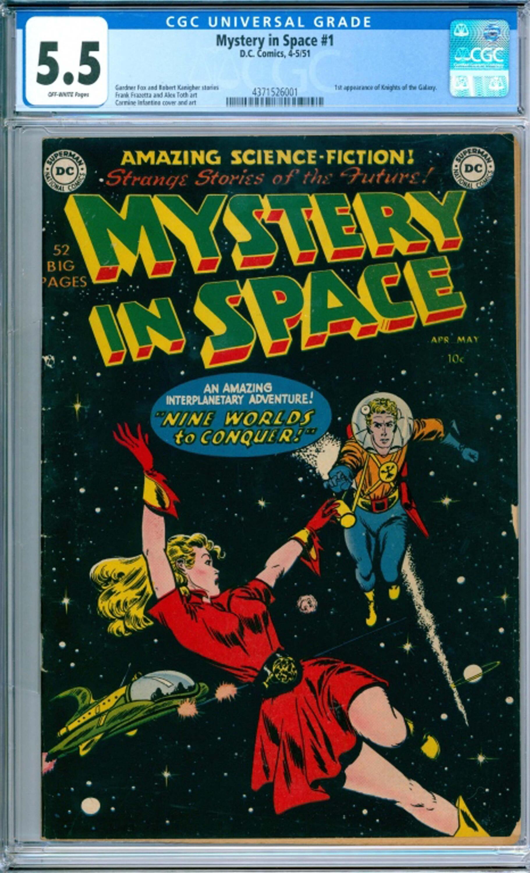 • A copy of DC Comics Mystery in Space #1 (April-May 1951), graded CGC 5.5, featuring the first appearance of Knights of the Galaxy, cover art by Carmine Infantino. Per the CGC census, 5 are graded 5.5; 61 are graded higher than that.